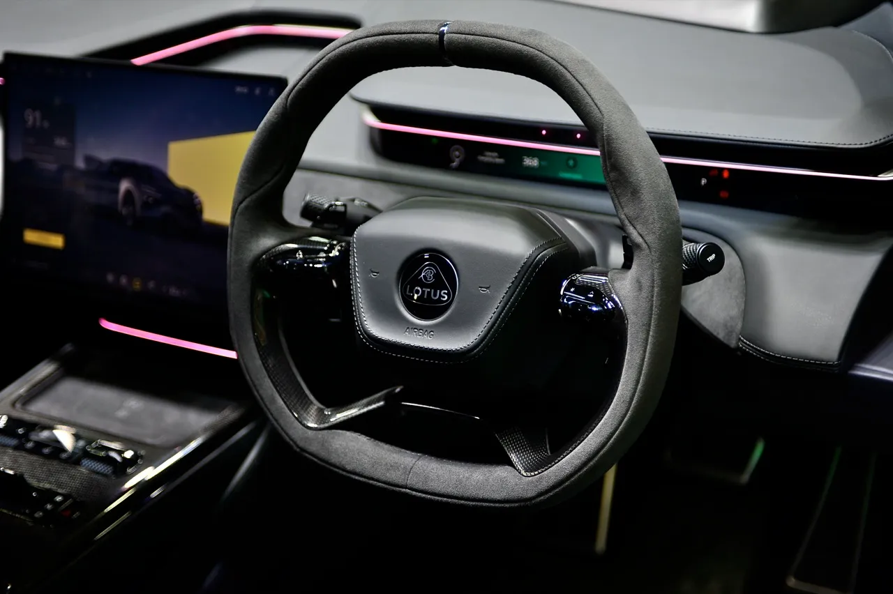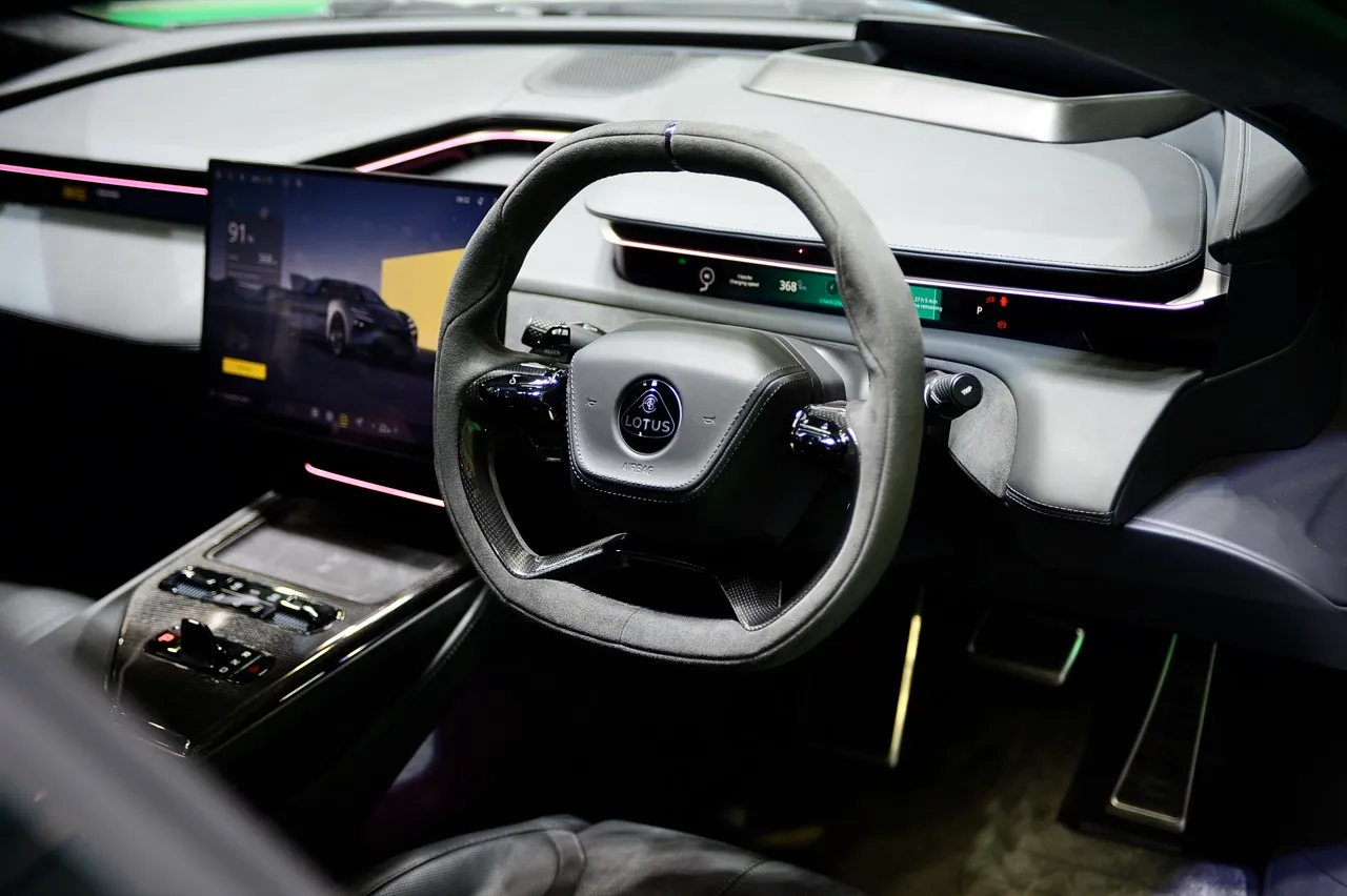 ความสามารถด้านเทคโนโลยีของ Lotus Technology ระบบประมวลผล NVIDIA รองรับระบบขับอัตโนมัติ Level 4 ที่จะเกิดขึ้นในอนาคต ด้วยโปรเซสเซอร์ Snapdragon 8155 ล่าสุดจาก Qualcomm ซอฟต์แวร์ Unreal Engine 6 ยกระดับความปลอดภัยด้วยเซนเซอร์รอบคัน 36 ตัว สูงสุด 30 ครั้งต่อวินาที เพื่อการรับรู้แบบ 360 องศาได้อย่างครอบคลุม สแกนหาสิ่งกีดขวางที่ระยะ 200 เมตร ระบบส่องสว่าง Matrix LED ปรับระดับการส่องสว่างอัตโนมัติแบบ Active ข้อมูลการขับเคลื่อนที่สำคัญจะปรากฏบนจอแสดงผลยิงสะท้อนบนกระจกหน้าคนขับ แสดงข้อมูลสำคัญ เช่น เส้นทางและคำเตือนของระบบช่วยเหลือผู้ขับตลอดความกว้างของกระจกหน้ารถ หน้าจอสัมผัสส่วนกลางขนาดใหญ่พร้อมการเชื่อมต่อ 5G และความสามารถในการอัปเดตแบบ over-the-air ขนาบข้างด้วยจอแสดงผลดิจิทัลที่บางกว่า 2 จอ หนึ่งจอสำหรับคนขับ และอีกจอหนึ่งเล็กๆ สำหรับผู้โดยสาร แดชบอร์ดออกแบบในรูปแบบที่สะท้อนขนาดความกว้างของ Hyper GT
