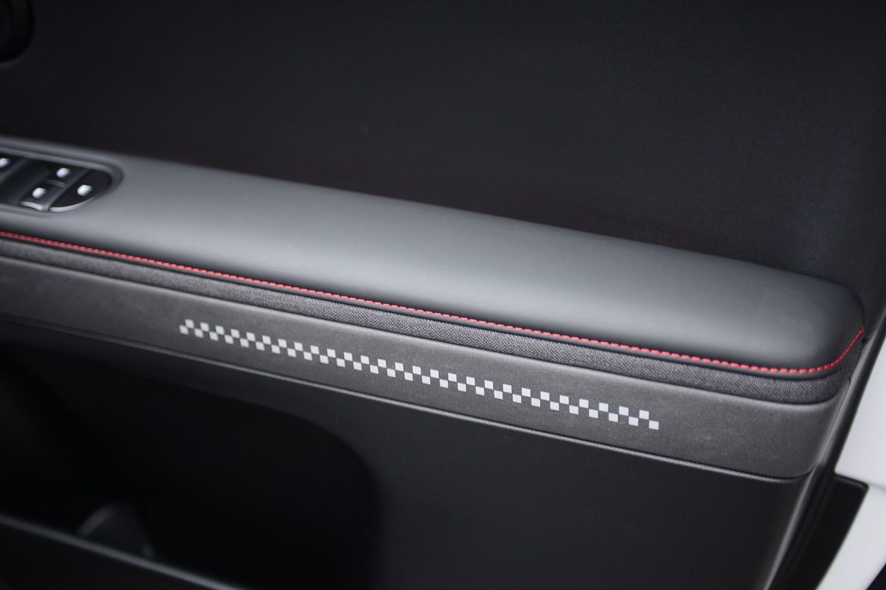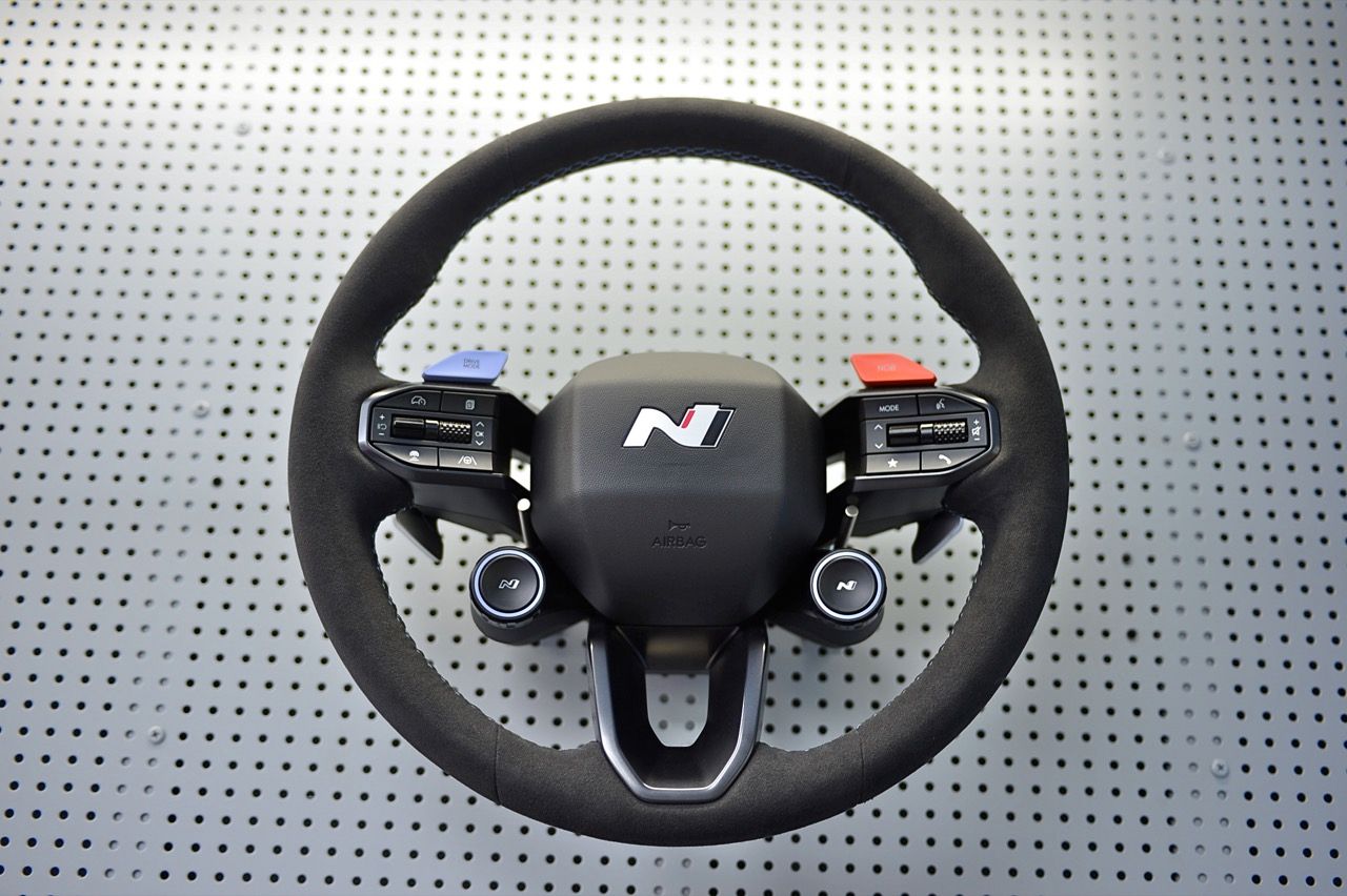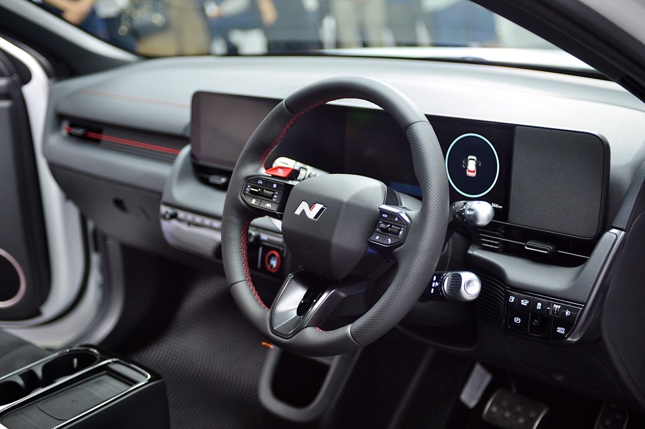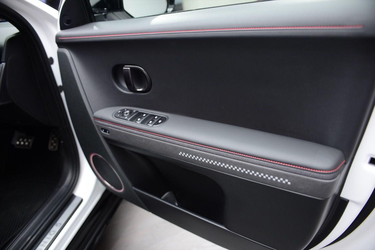 ห้องโดยสารของ IONIQ 5 N Line พวงมาลัยหุ้มหนังฉลุลายพร้อมตะเข็บด้ายแดง เบาะนั่งแบบสปอร์ต หุ้มด้วยหนังกลับ Alcantara สไตล์รถแข่ง โลโก้ N เบาะคนขับ ปรับเอนนอนได้แบบ Zero Gravity ด้วยไฟฟ้า พร้อมที่พักขา แป้น คันเร่งและเบรกดีไซน์สปอร์ต แผงหน้าปัด N Line แผงบุหลังคาสีดำ คอนโซลกลางแบบ Universal Island ปรับปรุงใหม่ วางปุ่มควบคุมต่าง ๆ ในตำแหน่งที่เข้าถึงง่าย แท่นชาร์จไร้สายที่ย้ายมาตำแหน่งด้านบนของคอนโซลกลาง
