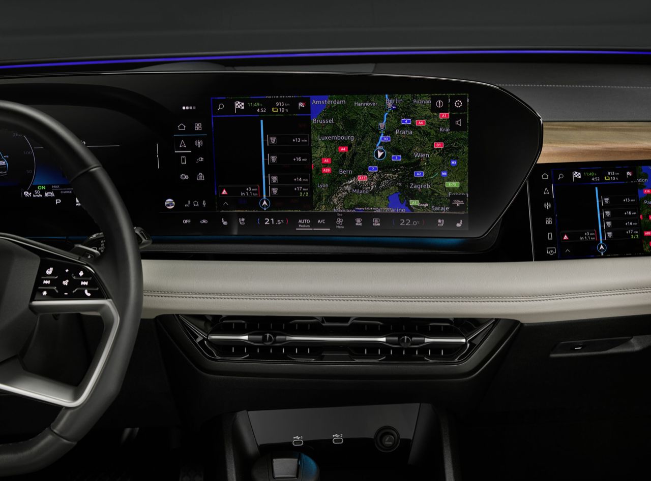 หน้าจอ Curved MMI Panoramic Display โค้งเข้าหาคนขับ เพื่อการใช้งานที่ง่ายและสะดวกยิ่งขึ้น มาพร้อม Audi virtual cockpit plus ขนาด 11.9 นิ้ว หน้าจอระบบสัมผัส MMI touch display ขนาด 14.5 นิ้ว และ MMI front passenger display ขนาด 10.9 นิ้ว