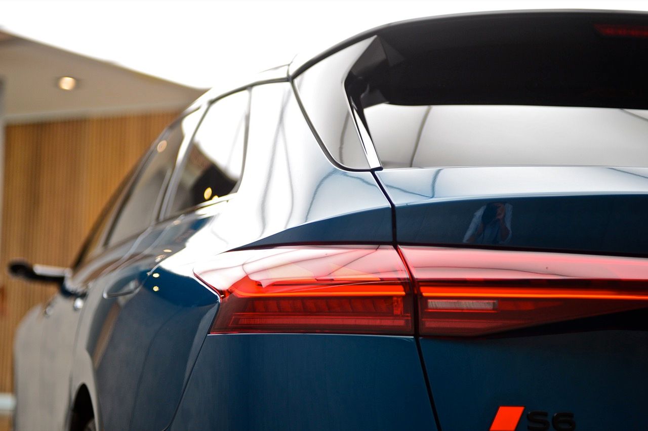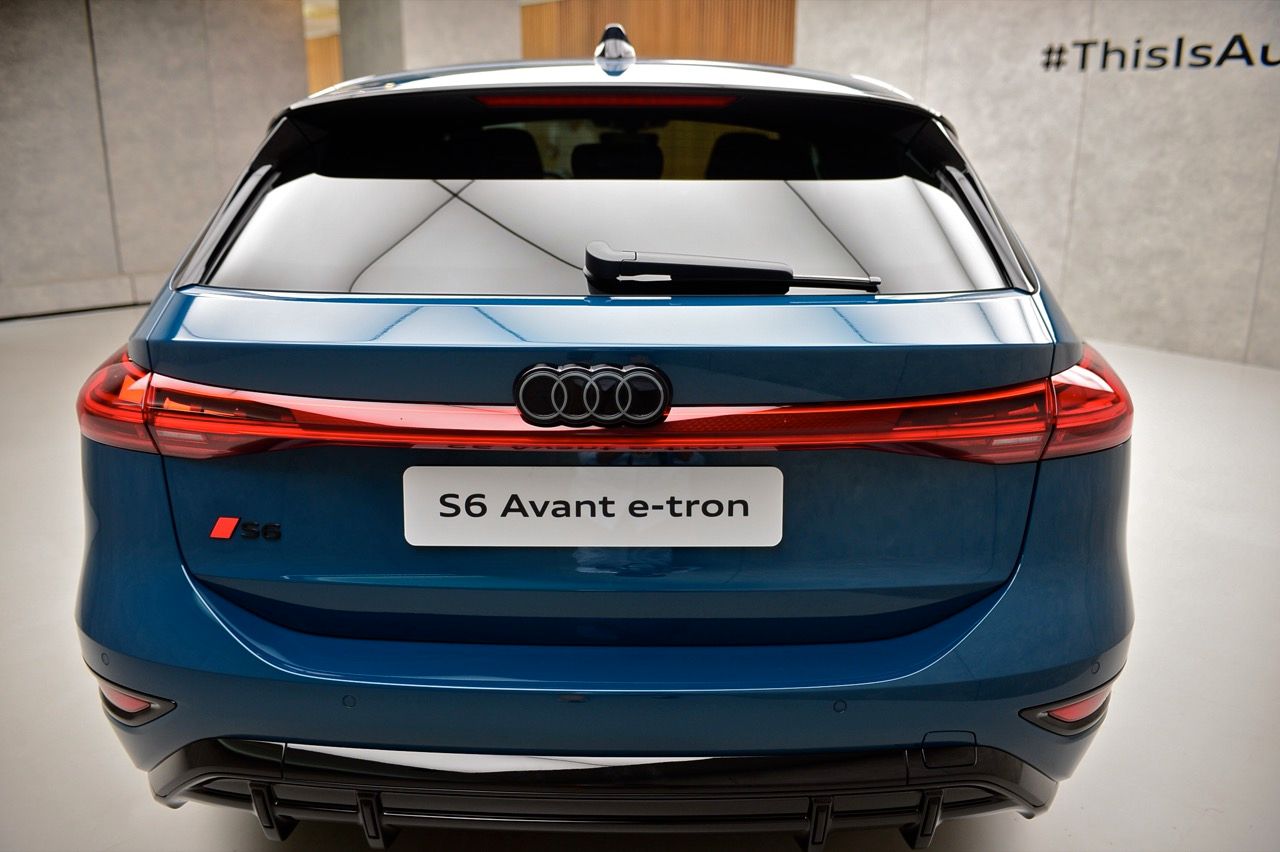 มีกราฟิคไฟส่องสว่างให้เลือกแปดแบบ สำหรับไฟวิ่งกลางวัน LED Daytime Running Light ลวดลายตารางถี่ที่เรียงซ้อนกันอย่างมีระเบียบในกรอบไฟหน้า (Audi มักจะรู้วิธีเอาใจคนที่ชอบของไฮเทค) ส่วนสีดำบนประตูมีตรา e-tron ออกแบบมาเพื่อแสดงให้เห็นว่าแบตเตอรี่ ซึ่งปัจจุบันเป็นหัวใจของรถ อยู่ใต้พื้น แผงสีดำด้านข้างนั้นช่วยแยกส่วนด้านข้างที่ลึกมาก ระยะโอเวอร์แฮงค์ทั้งหน้าและหลังค่อนข้างสั้น แต่มองให้ดีๆ คุณจะเห็นว่าความยาวของฐานล้อเกือบสามเมตร ทำให้ S6 มีพื้นที่ภายในค่อนข้างกว้างใช้ได้เลยทีเดียว