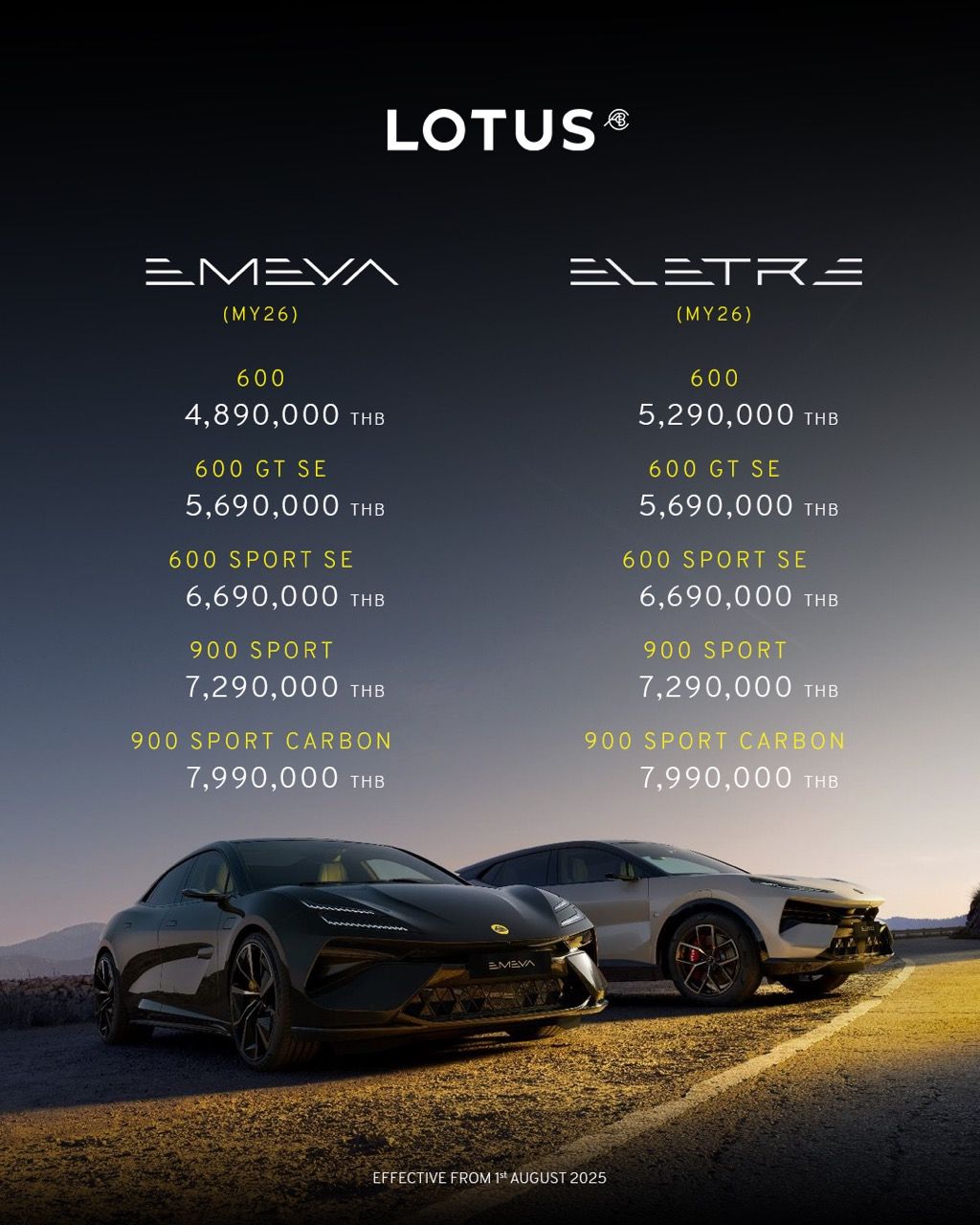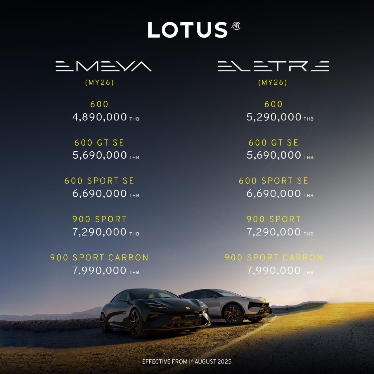 Lotus (MY26) รุ่นเริ่มต้น คือ “Emeya 600” และ “Eletre 600” มีความแตกต่างด้านออปชัน ระดับความเอ็กซ์คลูซีฟ แคมเปญเอ็กซ์คลูซีฟในการเปิดตัวราคาใหม่ ให้แก่ลูกค้ากลุ่มแรกที่ทำการจองภายใน 31 สิงหาคม 2568 นี้