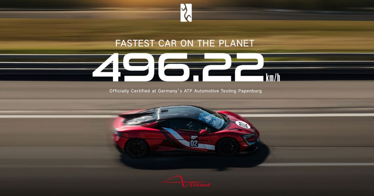 เกือบๆ 500 กิโลเมตรต่อชั่วโมง ใช่แล้ว เพียงไม่กี่อาทิตย์ หลังจากทำลายสถิติความเร็วสูงสุดของรถยนต์ไฟฟ้าที่ผลิตออกขาย เป็นรถยนต์ที่ถูกกฎหมายสำหรับใช้งานบนท้องถนนที่เร็วที่สุดในโลก ไม่ว่าจะเป็นรถยนต์ไฟฟ้าหรืออื่นๆ มันโค่นบัลลังก์ Bugatti Chiron Super Sport 300+ ซึ่งเคยทำความเร็วได้ 304.8 ไมล์ต่อชั่วโมง ( 490.05 กิโลเมตรต่อชั่วโมง) ในปี 2019 ก่อนหน้านี้เคยโค่น Aspark Owl (438 กิโลเมตรต่อชั่วโมง) และ Rimac Nevera R (431.6 กิโลเมตรต่อชั่วโมง) เรียกได้ว่าต่อยล้มทั้งยืนด้วยยันหว่าง! ทำลายล้างความเร็วท็อปสปีดของรถสันดาปทั้งสองคันอย่างราบคาบ