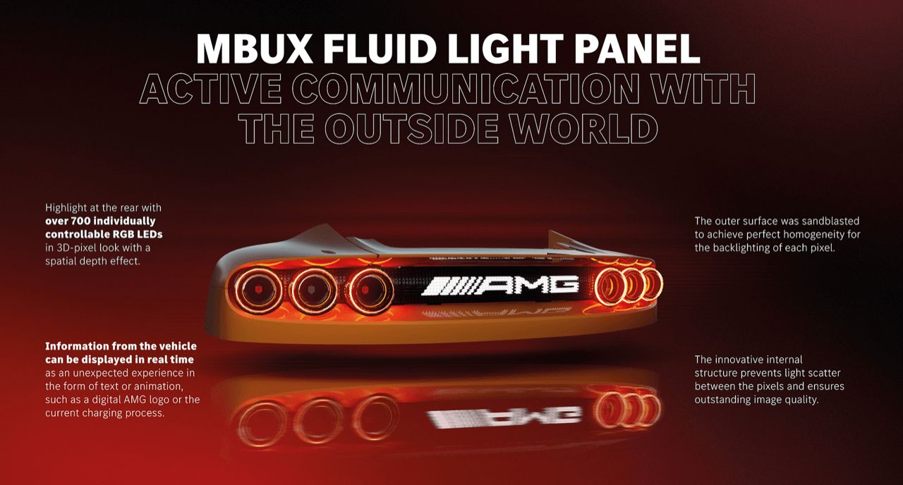 ช่องระบายความร้อนที่ฝากระโปรงหน้า เป็นช่องระบายอากาศแบบโดม สะท้อนถึงยุครุ่งเรืองของเครื่องยนต์สันดาปภายใน AMG GT XX ยังมีประสิทธิภาพด้านอากาศพลศาสตร์ที่ยอดเยี่ยม โดยมีค่าสัมประสิทธิ์แรงเสียดทานเพียง 0.20 (cd 0.20) สปลิตเตอร์ด้านหน้าและครีบระบายอากาศใต้พื้น ช่วยลดการยกตัว แผงควบคุมอากาศแบบแอ็คทีฟของ AMG เพิ่มประสิทธิภาพการระบายความร้อนให้กับมอเตอร์และแบตฯ นอกจากนี้ยังมีเบรกอากาศด้านหลังทำงานอัตโนมัติโดยจะยกตัวขึ้นมาในแนวตั้งคล้ายกับ McLaren 720s นอกจากไฟท้ายทรงกลมแล้ว ยังมีแผงไฟ LED RGB (แดง เขียว และน้ำเงิน) ที่ตั้งโปรแกรมได้ จำนวน 700 ดวง อยู่ตรงกลางระหว่างไฟท้ายทั้งสองฝั่ง Mercedes AMG แจ้งมาว่า หลอด LED เล็กๆ ทั้ง 700 ดวง สามารถแสดงข้อความ รูปแบบกราฟิกที่หลากหลาย แต่ตอนผลิตจริงน่าจะถูกยกเลิกเพราะลูกค้า AMG ส่วนใหญ่ไม่ชอบอะไรที่ดูแล้วแปลกตาหรือตลกเกินไป