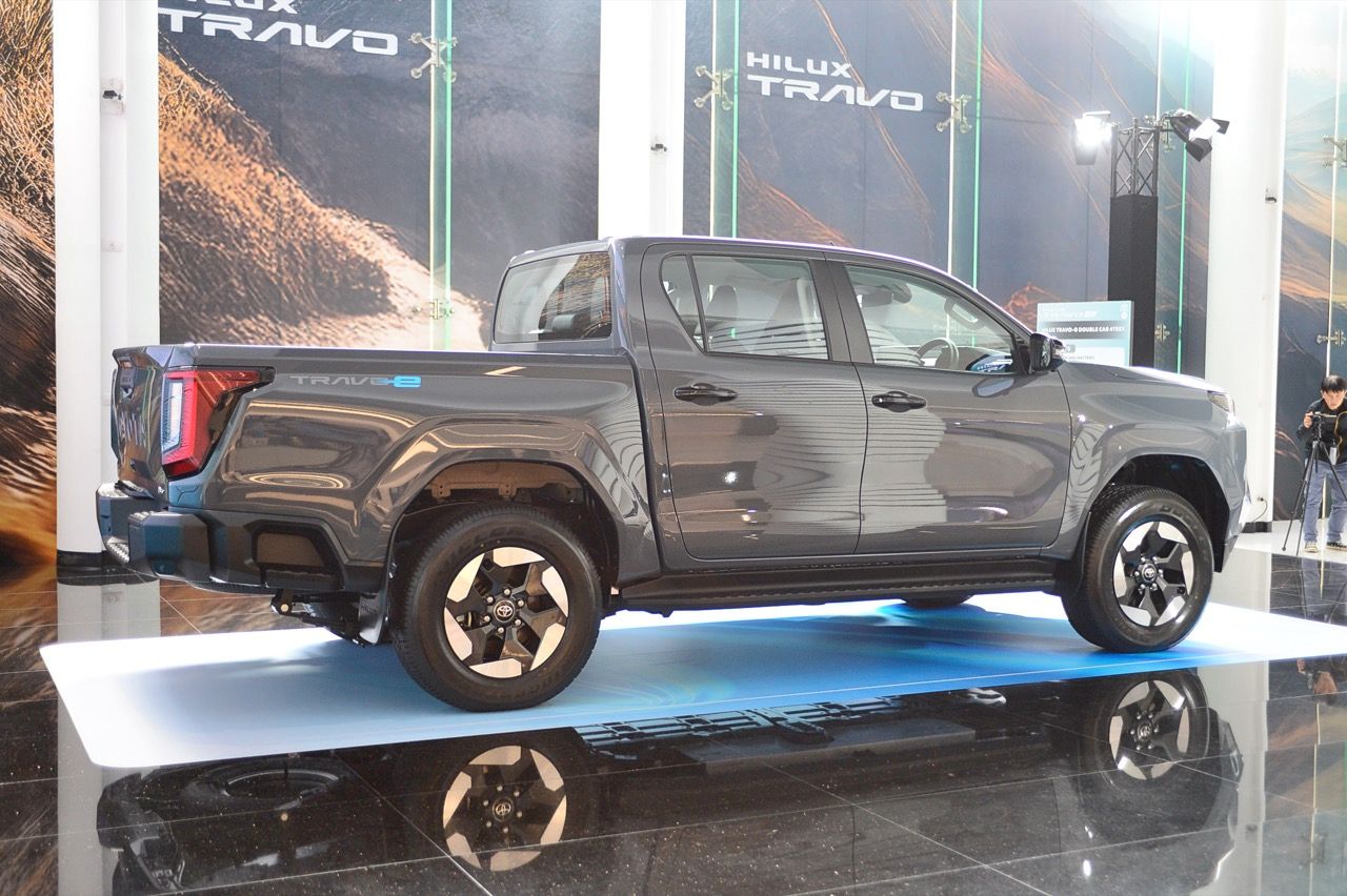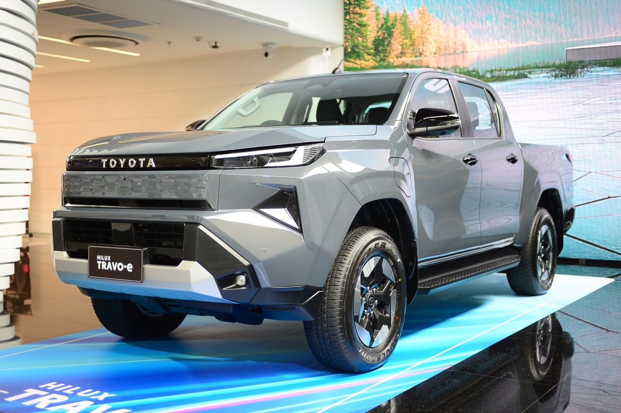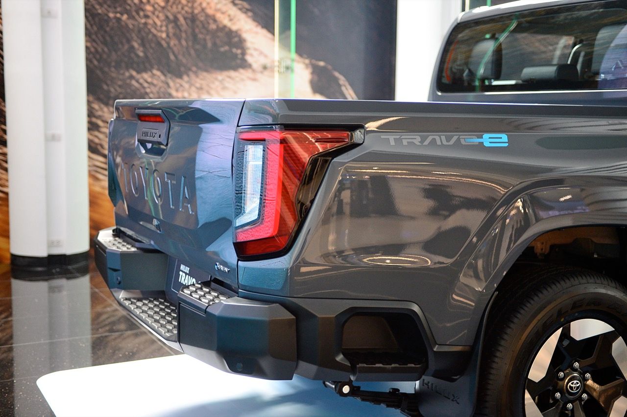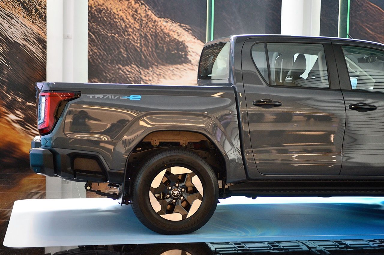 รถกระบะพลังงานสะอาด Hilux Travo-e กระบะไฟฟ้ารุ่นแรกของ Toyota เป็นปิกอัพพลังานไฟฟ้า BEV ระบบขับเคลื่อน มอเตอร์ไฟฟ้าคู่ แบตเตอรี่ลิเธี่ยมไอออน 59.2 kWh จุดชาร์จ อุปกรณ์ส่วนควบอื่นๆ แบตเตอรี่ถูกติดตั้งที่เฟรมด้านล่างของห้องโดยสาร พร้อมเฟรมกันกระแทก มอเตอร์ไฟฟ้าวางอยู่บนเพลาหน้าและหลัง ขับเคลื่อนสี่ล้อ Toyota ออกแบบคานแข็งใหม่ โดยไม่มีเพลากลางส่งกำลังเนื่องจากมอเตอร์ติดตั้งอยู่กับเพลาขับหน้า/หลัง ช่องชาร์จไฟอยู่ที่แก้มด้านซ้ายมือของตัวรถ มอเตอร์คู่ หน้า-หลัง มีกำลังรวม 196 แรงม้า (144 กิโลวัตต์) มอเตอร์หน้า แรงบิดสูงสุด 205 นิวตันเมตร มอเตอร์หลัง แรงบิดสูงสุด 269 มิลลิเมตร และแบตเตอรี่ลิเธี่ยมไอออน ติดตั้งอยู่ด้านล่างของพื้น Hilu Travo-e BEV ทำระยะทางต่อการชาร์จไฟจนเต็มหนึ่งไกล 315 กิโลเมตร รองรับการชาร์จไฟกระแสสลับ AC สูงสุด 10kW รองรับไฟฟ้ากระแสตรง DC แบบชาร์จเร็ว สูงสุด 125 kW