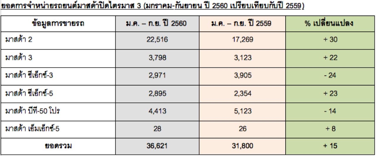สำหรับยอดขายรถยนต์มาสด้าเมื่อปิดไตรมาสที่ 3 ของปี 2560 ยังคงเติบโตร้อนแรงต่อเนื่อง ด้วยยอดขายทะลุถึง 36,621 คัน หรือเติบโตเพิ่มขึ้น 15% เมื่อเปรียบเทียบกับช่วงเวลาเดียวกันของปี 2559 โดยเฉพาะมาสด้า2 ยังคงเป็นฮีโร่ที่สร้างยอดขายมากที่สุดถึง 22,516 คัน เพิ่มขึ้น 30% รั้งอันดับ 2 ในเซ็กเมนต์ (โดยเฉพาะในเดือนสิงหาคมที่ผ่านมาทำเซอร์ไพรส์ขยับขึ้นครองแชมป์ในเซ็กเมนต์นี้มาแล้ว) ส่วนมาสด้า3 ยังคงร้อนแรงไม่แพ้กัน กวาดยอดขายไปได้ทั้งสิ้น 3,798 คัน เพิ่มขึ้น 22% และที่กำลังมาแรงแบบสุดๆ นั่นคือ รถอเนกประสงค์เอสยูวีมาสด้า ซีเอ็กซ์-5 ทำยอดขายไปได้สูงถึง 2,895 คัน เพิ่มขึ้น 22% ส่วนครอสโอเวอร์มาสด้า ซีเอ็กซ์-3 มียอดขายรวมทั้งสิ้น 2,971 คัน และรถปิกอัพมาสด้า บีที-50 โปร ทำยอดขายไปได้ถึง 4,413 คัน นอกจากนี้ในส่วนของรถสปอร์ตโรดสเตอร์ เอ็มเอ็กซ์-5 ก็มีแฟนพันธุ์แท้เข้ามาจับจองเป็นเจ้าของมากถึง 28 คัน