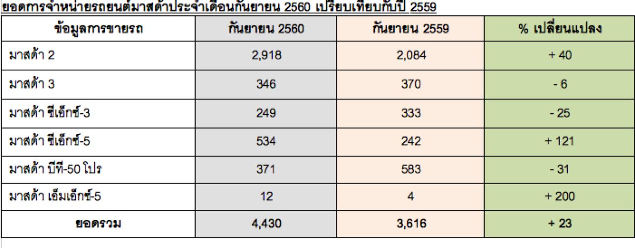 สำหรับตัวเลขยอดขายรถยนต์มาสด้าล่าสุดเดือนกันยายน 2560 ที่ผ่านมา มียอดขายสูงถึง 4,430 คัน หรือเติบโตเพิ่มขึ้นถึง 23% เมื่อเปรียบเทียบกับเดือนกันยายน 2559 โดยรุ่นที่ได้รับความนิยมมากที่สุดยังคงเป็นสปอร์ตตัวจี๊ด มาสด้า2 มียอดขายสูงถึง 2,918 คัน เติบโตเพิ่มขึ้นถึง 40% ส่วนรถอเนกประสงค์เอสยูวี มาสด้า ซีเอ็กซ์-5 ได้กำลังรับความสนใจจากลูกค้าเป็นอย่างมากอยู่ในเวลานี้ หลังจากที่มาสด้าประกาศโปรโมชั่นสุดพิเศษ ด้วยอัตราดอกเบี้ยต่ำสุด 0% และผ่อนนานถึง 6 ปี อีกทั้งยังมอบฟรีประกันภัยชั้น 1 Mazda Premium Insurance และฟรีค่าบำรุงรักษา หรือ Mazda Care โดนใจลูกค้าที่ชื่นชอบรถสไตล์ครอสโอเวอร์ ส่งผลให้ยอดขายพุ่งทะลุถึง 534 คัน เติบโตสูงสุดถึง 121%
