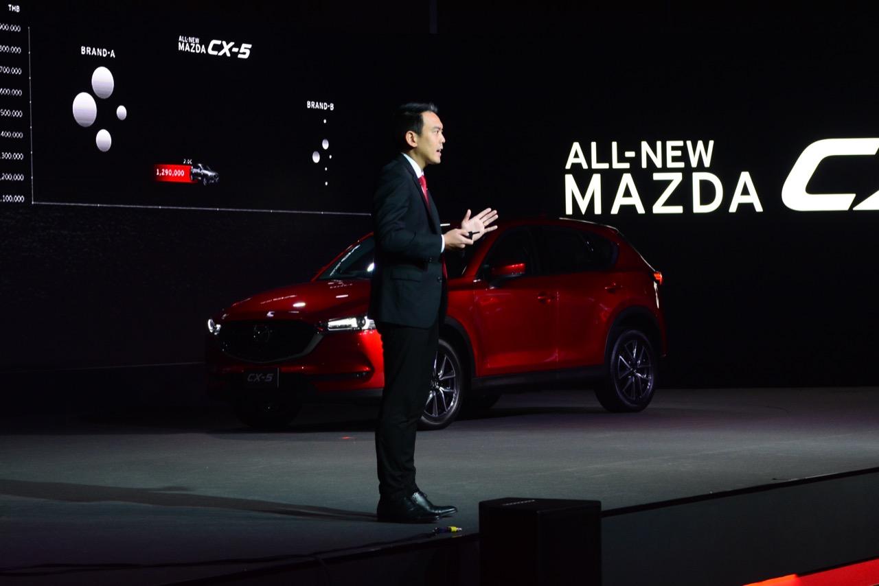 ชาญชัย ตระการอุดมสุข ประธานบริหาร บริษัท มาสด้า เซลส์ (ประเทศไทย) จำกัด กล่าววถึง CX-5 รถยนต์รุ่นใหม่ล่าสุดว่า ALL-NEW MAZDA CX-5 โฉมใหม่ มาพร้อมกับคอนเซ็ปต์ “เป็นที่สุดในทุกบทบาท” MAKE ALL CHAPTERS REMARKABLE นี่คือรถอเนกประสงค์ที่เป็นที่สุดในคลาส One Class Above ภายใต้การออกแบบใหม่ล่าสุดจาก โคโดะ ดีไซน์ เจนเนอเรชั่นใหม่ ที่สะท้อนถึงพลังของจิตวิญญาณที่ซ่อนอยู่ภายใต้ความเคลื่อนไหวอันสง่างาม ผนวกกับวิวัฒนาการที่ก้าวไปอีกขั้นของเทคโนโลยีสกายแอคทีฟ เจาะตลาดกลุ่มลูกค้าในวงกว้างมากขึ้น
