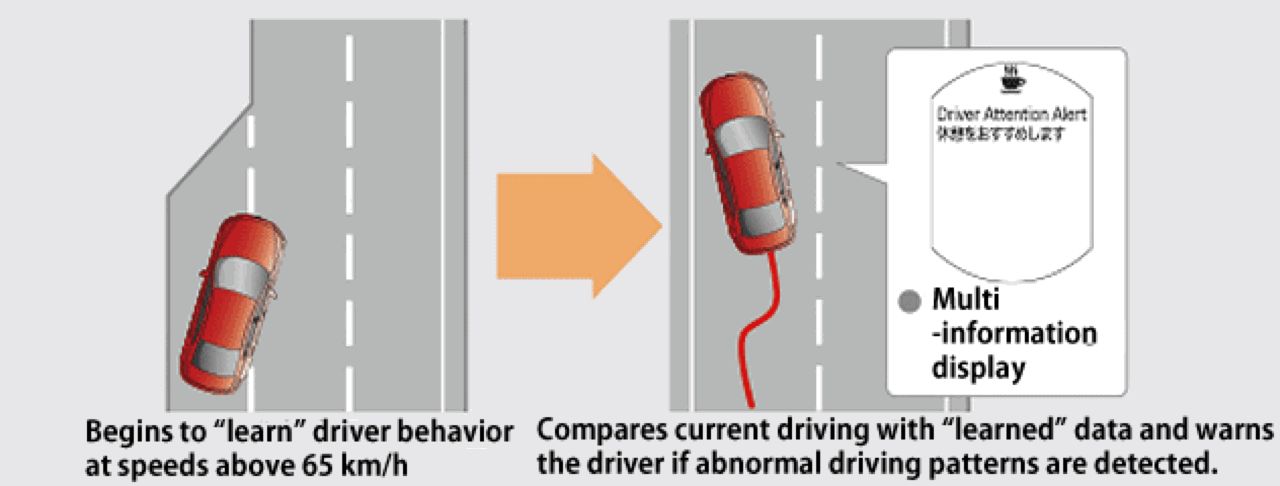 ระบบช่วยเตือนเมื่อผู้ขับเหนื่อยล้าขณะขับขี่ ช่วยเพิ่มความปลอดภัยยิ่งขึ้น โดยเฉพาะขณะขับรถทางไกล ระบบจะติดตามพฤติกรรมและสมาธิในการขับขี่ หากตรวจพบความผิดปกติของพฤติกรรมการขับขี่ หรือขับขี่ติดต่อกันนาน ระบบจะขึ้นข้อความแนะนําให้หยุดพัก