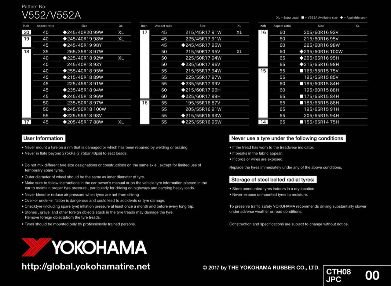 YOKOHAMA ADVAN dB V552 ออกแบบและพัฒนาขึ้นมาเพื่อมอบสุนทรียภาพความนุ่มเงียบที่เหนือใครอย่างที่ไม่เคยมีมาก่อน เพิ่มความมั่นใจและความปลอดภัยในทุกการขับขี่ เหมาะสำหรับการขับขี่ในชีวิตประจำวัน มีทั่งหมด 45 ขนาด ตั้งแต่ขอบ 14–20 นิ้ว หน้ากว้าง 155–265 มิลลิเมตร ราคาเริ่มต้นที่ 2,850 บาท