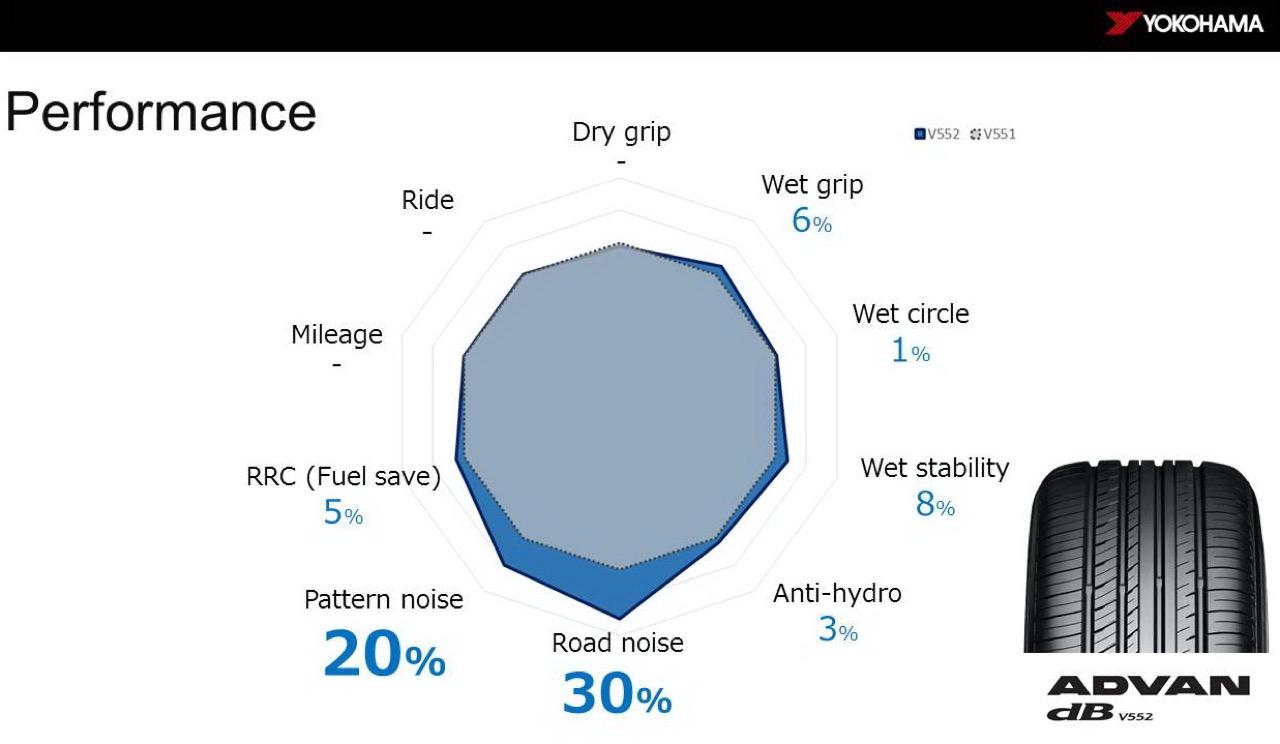 ทาเคโตชิ โมริตะ (Mr. Taketoshi Morita) กรรมการผู้จัดการ บริษัท โยโกฮามา ไทร์ เซลส์ (ประเทศไทย) จำกัด เปิดเผยว่า YOKOHAMA ADVAN dB V552 เป็นยางรถยนต์พรีเมียมสำหรับกลุ่มรถยนต์ซีดานหรูขนาดกลางและขนาดใหญ่ อาทิ Nissan teana, Honda Accord, Toyota Camry, BMW Series 4, 5, 6, 7, Mercedes Benz E-class, S-class