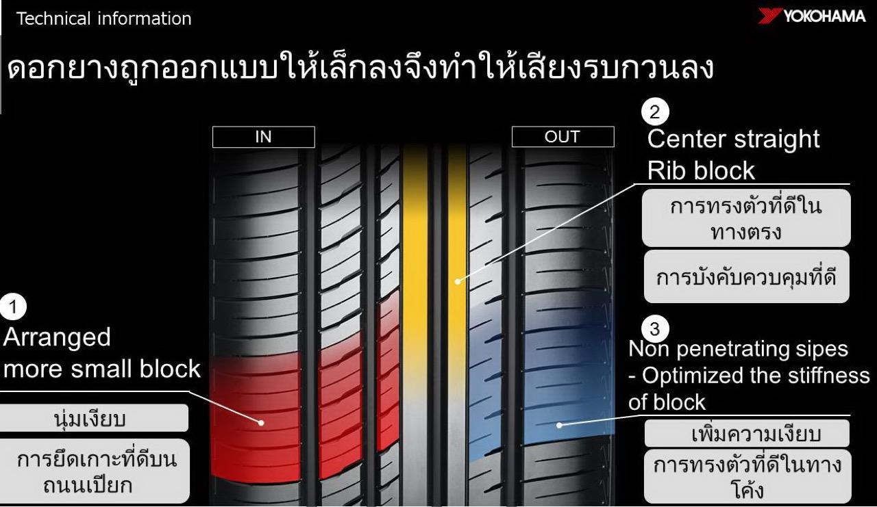 บล็อกดอกยาง ออกแบบให้มีการลบเหลี่ยมมากขึ้น และลักษณะร่องยางบิดเป็นเกลียว ช่วยเพิ่มความแข็งแรงของดอกยาง เพิ่มสมรรถนะในการทรงตัว ทั้งยังช่วยลดเสียงรบกวน และลดการสึกแบบไม่เรียบ ทำให้ยางมีความนุ่มเงียบยาวนานยิ่งขึ้น นอกจากนี้ ยังออกแบบบล็อกดอกยางให้มีขนาดแตกต่างกัน เพื่อช่วยการกระจายความถี่เสียงเมื่อยางสัมผัสกับพื้นถนน ส่งผลให้เสียงรบกวนในห้องโดยสารลดลง