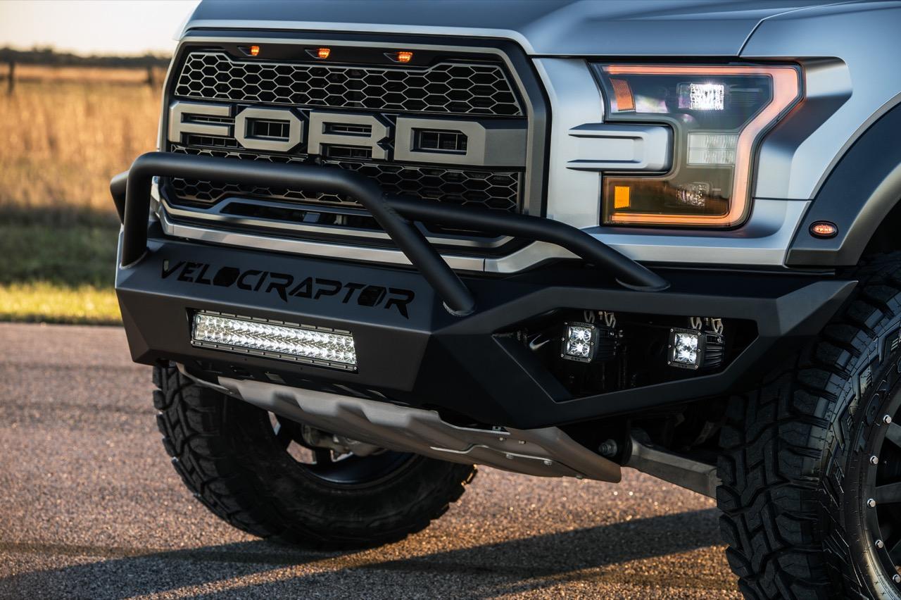 Ford F-150 รุ่นพิเศษที่นำเอาชื่อของไดโนเสาร์นักล่าเจ้าความเร็วในยุคจูราสิค หรือที่รู้จักกันดีในชื่อ Raptor มาตกแต่งอัดอุปกรณ์เสริมความโหดทั้งภายนอกและภายในให้ดูแข็งแกร่งดุดัน ไฟหน้ากับกระจังหน้าเข้ากันอย่างยิ่งด้วยกระจังขนาดใหญ่ยักษ์ลายรังผึ้งแปะตราสัญลักษณ์ FORD เพื่อข่มขู่รถคู่แข่งอย่าง Toyota Tacoma TRD PRO! สปอยเลอร์หน้าเชื่อมโยงกับความดิบของไฟและกระจังได้อย่างลงตัว กลายเป็นหน้าตาของปิกอัพที่คนไทยอยากได้อยากมี ใต้ห้องเครื่องยนต์ติดแผ่นกันกระแทกทำจากโลหะสีเงิน บังโคลนหน้าขยายเพิ่มความใหญ่โตให้สมกับการเป็นตัวลุย