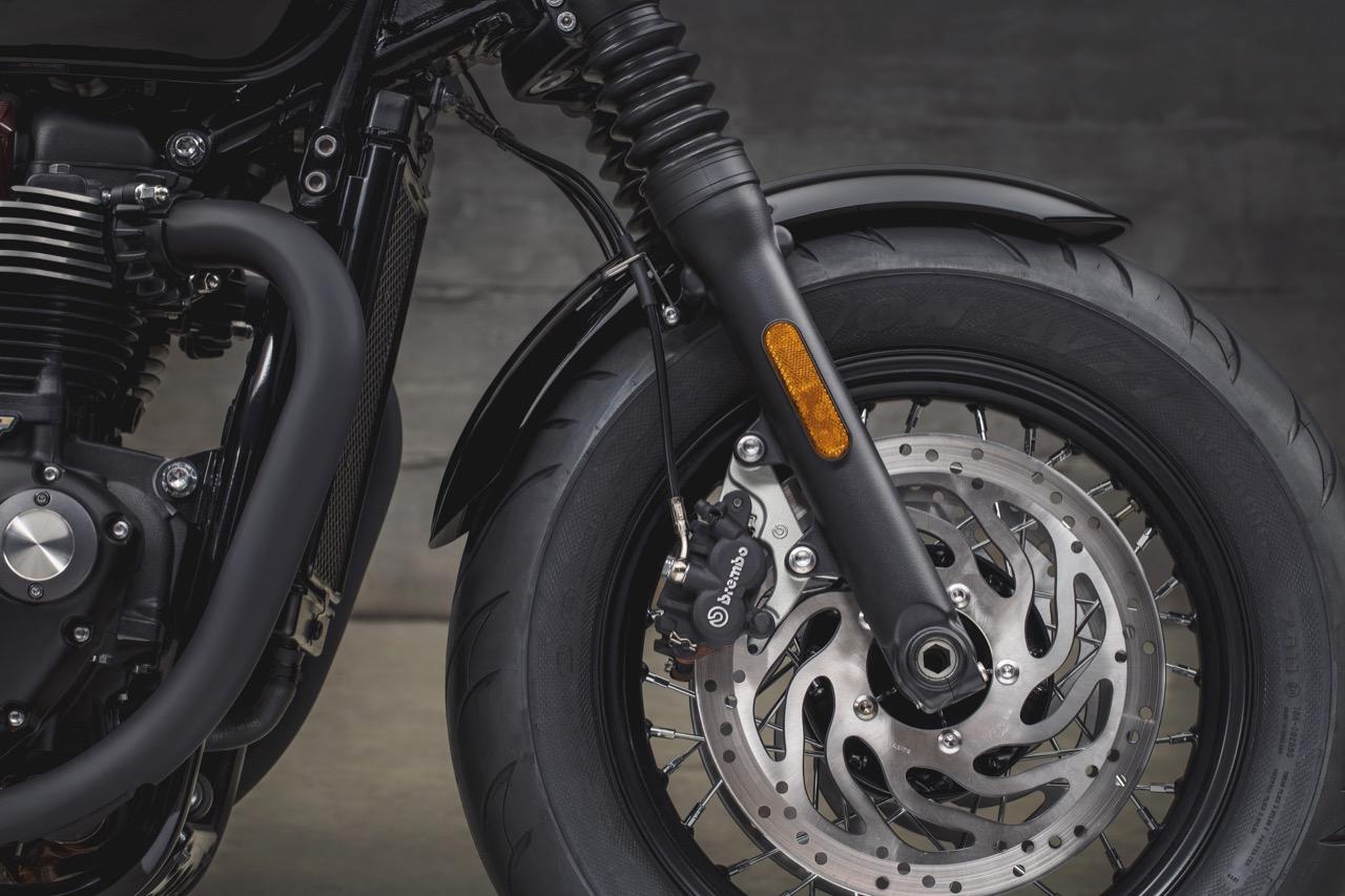 Triumph Bonneville Bobber Black มาพร้อมรูปลักษณ์ที่กำยำกว่าเดิมด้วยล้อหน้าซี่ลวดหนาขนาด 16 นิ้ว อีกทั้งแข็งแกร่งยิ่งขึ้นด้วยดิสก์เบรกหน้าแบบคู่พร้อมคาลิปเปอร์ 2 ลูกสูบแบบคู่จาก Brembo และกระบอกโช้คหน้า Showa