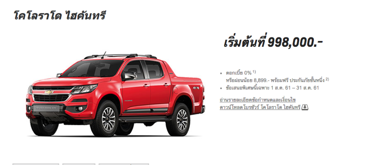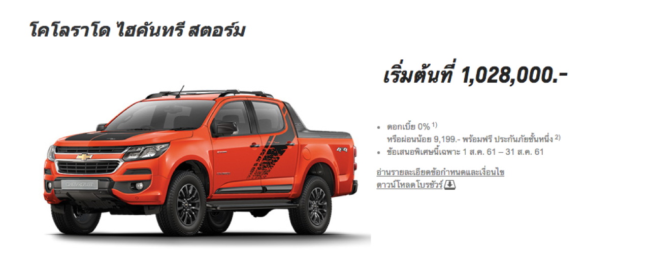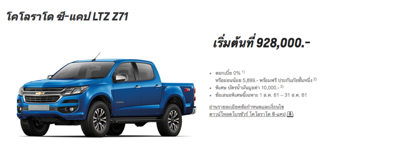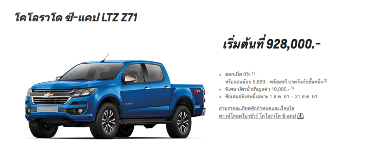 Chevrolet Colorado C-Cab LTZ Z71 เลือกดอกเบี้ย 0% หรือผ่อน 5,899 บาทต่อเดือน ฟรีประกันภัยชั้น 1 บัตรน้ำมันเฉพาะรุ่นมูลค่า 10,000 บาท โดยข้อเสนอ ‘เชฟโรเลต ซูเปอร์ ดีล’ เริ่มตั้งแต่วันที่ 1-31 สิงหาคม 2561 ที่โชว์รูม Chevrolet ทั่วประเทศ