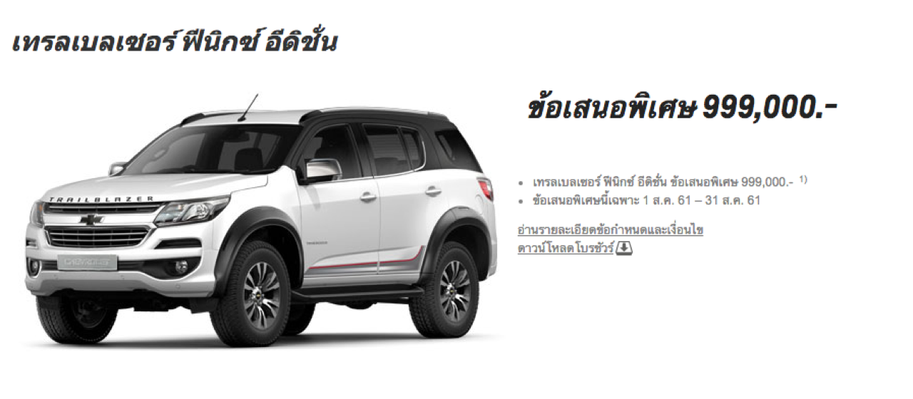 นางสาวอุณา ตัน ผู้อำนวยการฝ่ายการตลาดและประสบการณ์ลูกค้า บริษัท Chevrolet Sales Thailand กล่าวว่า “ในช่วงครึ่งปีหลังนี้ Chevrolet จัดกิจกรรมทางการตลาดเพื่อลูกค้าอย่างต่อเนื่อง ล่าสุดแนะนำข้อเสนอพิเศษ ‘เชฟโรเลต ซูเปอร์ ดีล’ สำหรับรถอเนกประสงค์ Chevrolet Trailblazer Phoenix edition ในราคาพิเศษ 999,000 บาท จากราคาปกติ 1,244,000 บาท (ราคารถรวมกับชุดอุปกรณ์ตกแต่งแพ็กเกจเต็มรูปแบบ)
