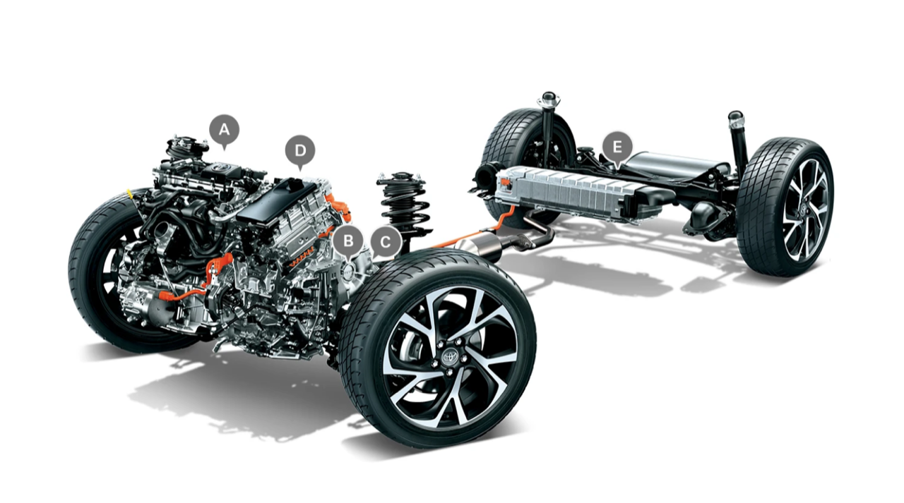 ระบบไฮบริดเจน 4 ของ Toyota ออกแบบให้ inverter with converter assembly มีขนาดเล็กและมีน้ำหนักเบา สามารถบูสไฟฟ้าแรงสูงอย่างรวดเร็วโดยติดตั้งอยู่ด้านบนของชุดเกียร์ ส่วนแบตเตอรี่ไฮบริดเป็นแบบ ni-mh battery DC 201.6 V168 Cell 6 cell x 28 modules แบตเตอรี่ติดตั้งอยู่ใต้เบาะหลังพร้อมชุดกรองฝุ่นและพัดลมไฟฟ้าระบายความร้อน โดยมี auxiliary battery ติดตั้งอยู่ในห้องเครื่องยนต์ เป็นแบบ EN Type LN1 auxiliary battery ส่วนชุดมอเตอร์ 2 ตัวที่ฝังอยู่ในเกียร์เป็นแบบ P610 hybrid transaxle MG1 / MG2 ขนาด 600 โวลต์ ระบายความร้อนด้วยน้ำ มอเตอร์ไฟฟ้า MG 1 ของ C-HR มีแรงดันไฟฟ้าสูงสุด AC600 V กำลังสูงสุด 53 กิโลวัตต์ ส่วนมอเตอร์ไฟฟ้า MG 2 มีแรงบิดสูงสุด 163 นิวตันเมตร มีแรงดันไฟสูงสุด AC600 V