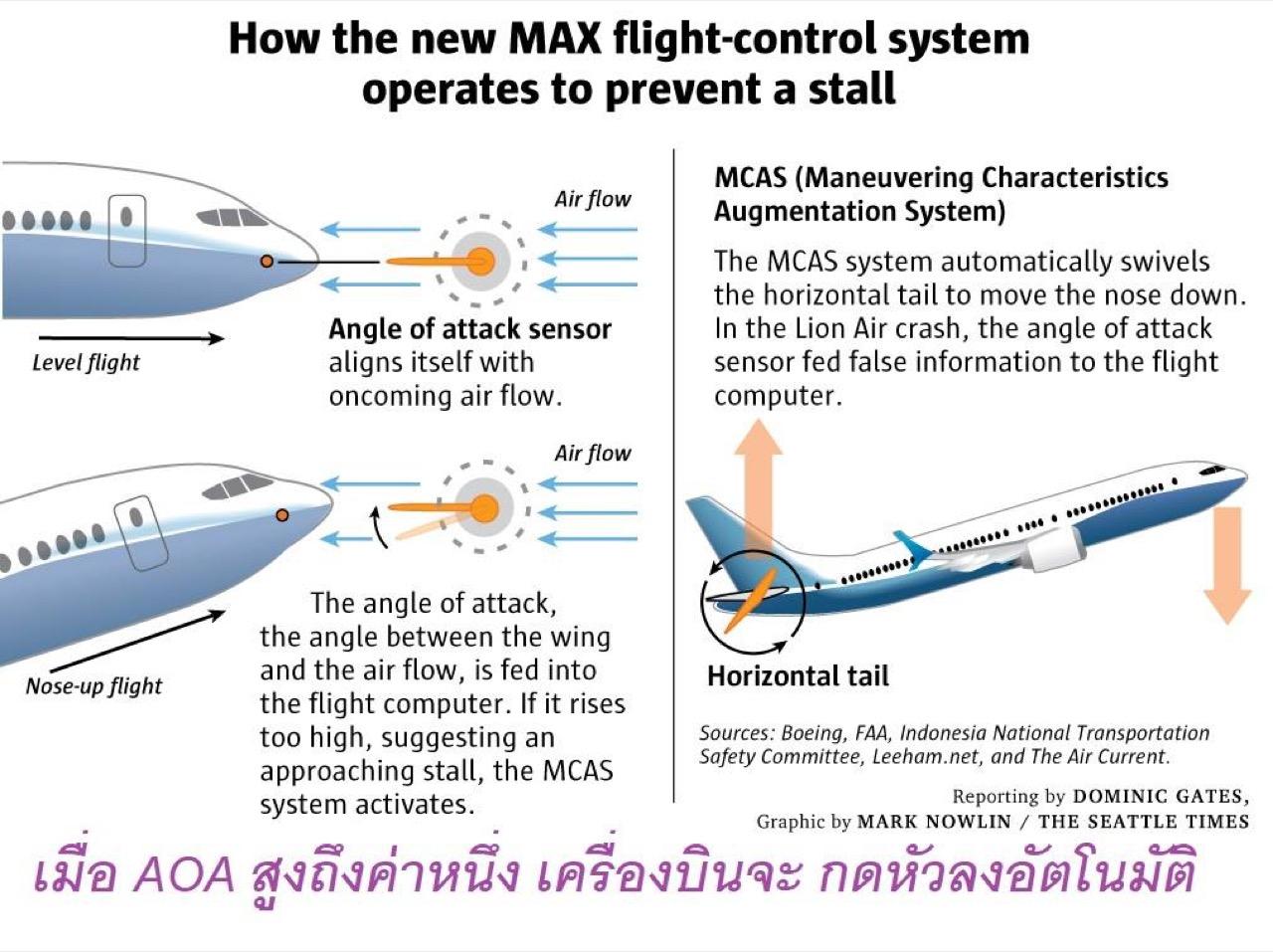 ก่อนอื่น Boeing 737 max มีระบบที่เรียกว่า MCAS (Maneuvering Characteristics Augmentation System) ซึ่งเป็นระบบช่วยควบคุมเครื่องบินอัตโนมัติ เอาไว้ป้องกันการสูญเสียแรงยกของปีกเครื่องบิน เครื่องบินในกรณีเชิดหัวเครื่องมาก หรือ เวลาเลี้ยวเครื่องบินแบบเลี้ยวปีกลึก (Steep turn) ซึ่งอาจเกิดอาการที่กระแสอากาศไม่เกาะไปกับปีก หรือ Stall ซึ่งจะทำให้เครื่องตกได้ MCAS จะทำงานเมื่อเกิดสถานการณ์เข้าสู่วิกฤติ คือ มุม AOA 10-12 องศา