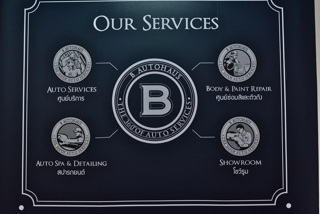 ทั้งนี้ภายใต้คอนเซปต์ 360 degrees of auto services ของเรา B Autohaus พร้อมให้บริการอย่างครบวงจร นับตั้งแต่ฝ่ายขาย ฝ่ายบริการ (Auto Service) ฝ่ายซ่อมตัวถังและสี (Auto Color Lab) และฝ่ายสปารถยนต์ (Auto Essence) เพื่อมุ่งตอบโจทย์ลูกค้าระดับไฮเอนด์ในทุกด้านอย่างมืออาชีพ สามารถรองรับความต้องการบริการดูแลรถได้หลากหลายยี่ห้อ ทั้ง Mercedes Benz, BMW, Toyota, Porsche, Mini, Range Rover, Ford Mustang, Jeep และแบรนด์นำเข้าอีกมากมาย