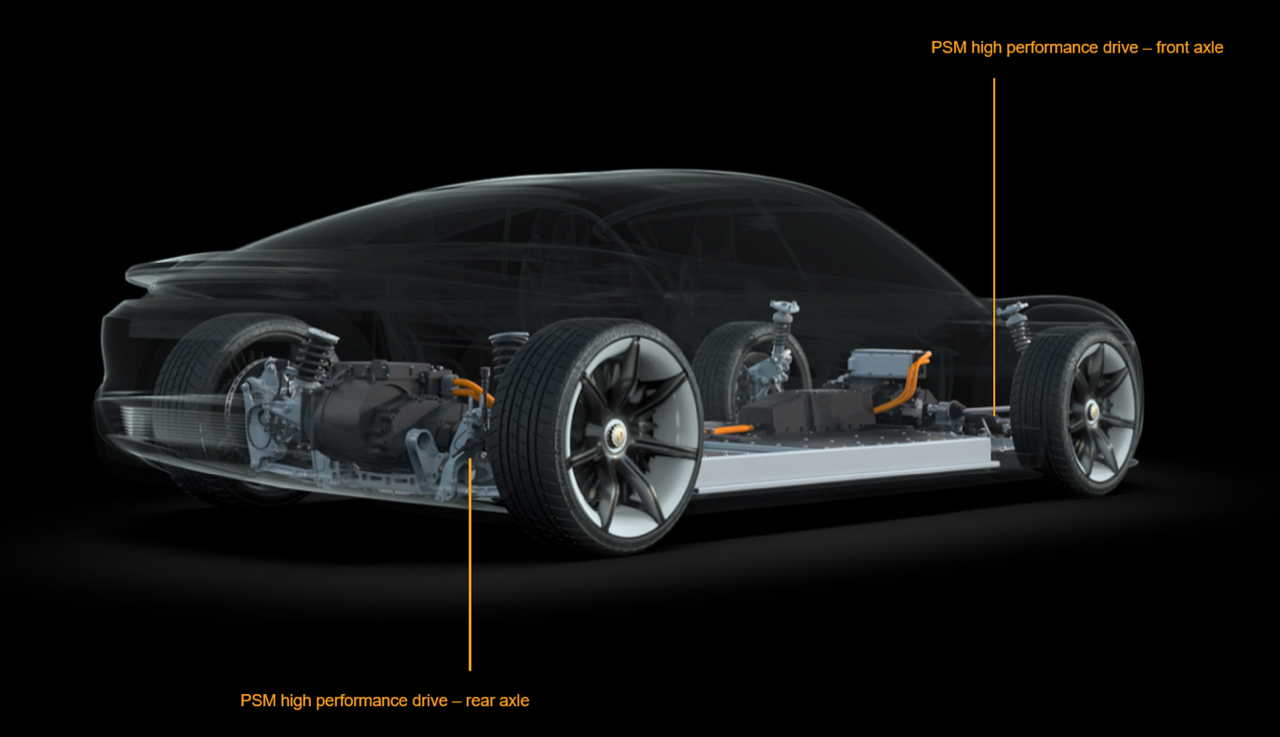 Porsche Taycan ใช้มอเตอร์ไฟฟ้าขับเคลื่อนประสิทธิภาพสูง 2 ตัว แบบ Permanently Excited Synchronous Motors (PSM) เมื่อทำงานพร้อมๆ กันทั้งสองตัว สามารถผลิตกำลังสูงสุดได้มากกว่า 600 แรงม้า หรือมากถึง 440 กิโลวัตต์ ทำอัตราเร่งจากจุดหยุดนิ่งถึงความเร็ว 100 กิโลเมตรต่อชั่วโมง ภายในระยะเวลาต่ำกว่า 3.5 วินาที และพุ่งทะยานสู่ความเร็วสูงสุดถึง 200 กิโลเมตรต่อชั่วโมง ภายใน 12 วินาที สมรรถนะระดับซุปเปอร์คาร์ เกิดขึ้นโดยข้อได้เปรียบของการถ่ายทอดกำลังขับเคลื่อนจากมอเตอร์ไฟฟ้าที่ต่อเนื่อง เป็นคุณสมบัติพิเศษของยานพาหนะพลังงานไฟฟ้ารุ่นใหม่ล่าสุดจาก Porsche การเร่งออกตัวอย่างฉับไวเกิดจากประสิทธิภาพการทำงานของส่วนประกอบ ปราศจากการสูญเสียใดๆ ในระบบโดยสิ้นเชิง รถสปอร์ตพลังงานไฟฟ้าคันนี้มีระยะทำการไกลขึ้นต่อการชาร์จไฟจนเต็ม โดยสามารถเดินทางไกลมากกว่า 500 กิโลเมตร ตามมาตรฐานของ NEDC