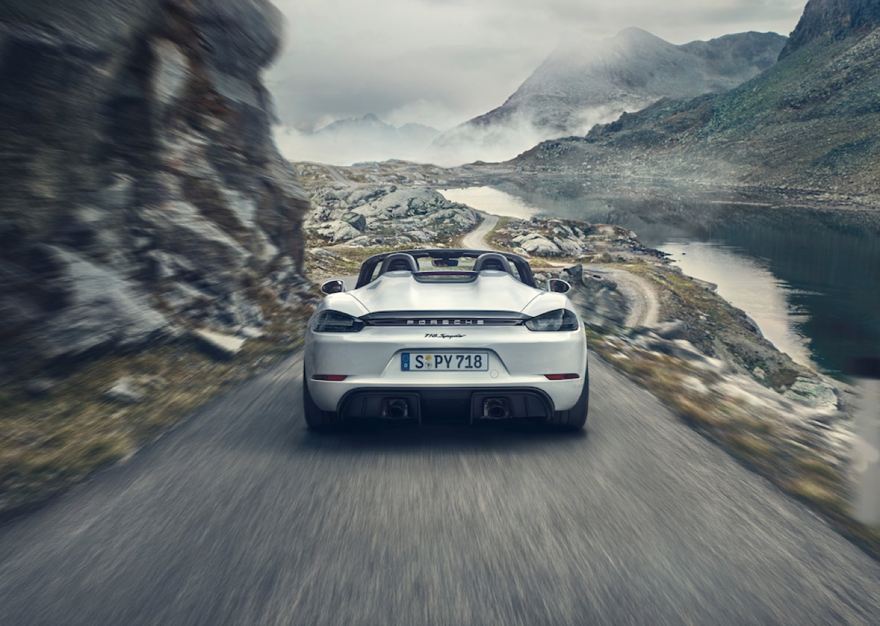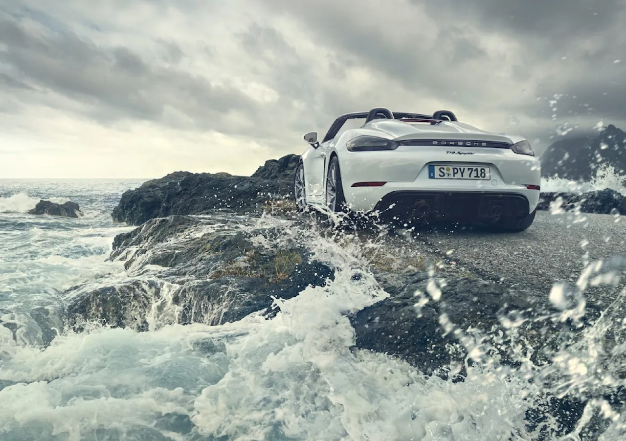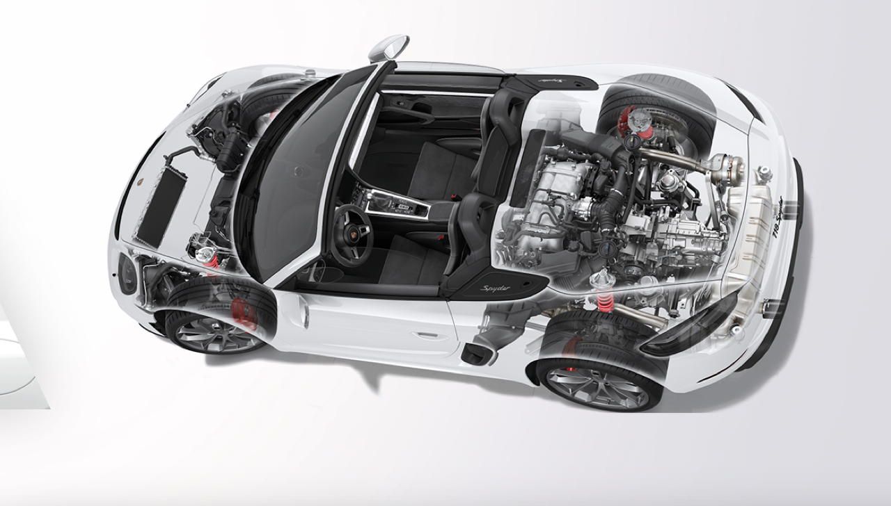 The new Porsche 718 Spyder ถือกำเนิดขึ้นในฐานะยานยนต์สปอร์ตประสิทธิภาพสูงที่เน้น สมรรถนะการขับขี่ มาพร้อมหลังคาประทุนน้ำหนักเบาที่ใช้งานได้จริงในความเร็วสูง เป็นตำนานสานต่อจากรถสปอร์ตโรดสเตอร์ที่สร้างชื่อเสียงไว้ในอดีต เช่น Porsche 550 Spyder และ Porsche 718 RS 60 Spyder หลังคาประทุนได้รับการออกแบบให้เหมาะกับการใช้งานประจำวัน สามารถพับเก็บลงภายใต้ฝากระโปรงท้ายด้วยการทำงานที่รวดเร็ว จุดสังเกตของ 718 Spyder ที่มีความแตกต่างจากรุ่น จีที 4 (GT4) คือสปอยเลอร์หลังแบบอัตโนมัติ ทำงานที่ความเร็ว 120 กิโลเมตรต่อชั่วโมง และเมื่อทำหน้าที่ร่วมกับดิฟฟิวเซอร์ จะมีศักยภาพด้านอากาศพลศาสตร์โดยจะสร้างแรงกดบริเวณท้ายรถได้สูงอย่างเหลือเชื่อ