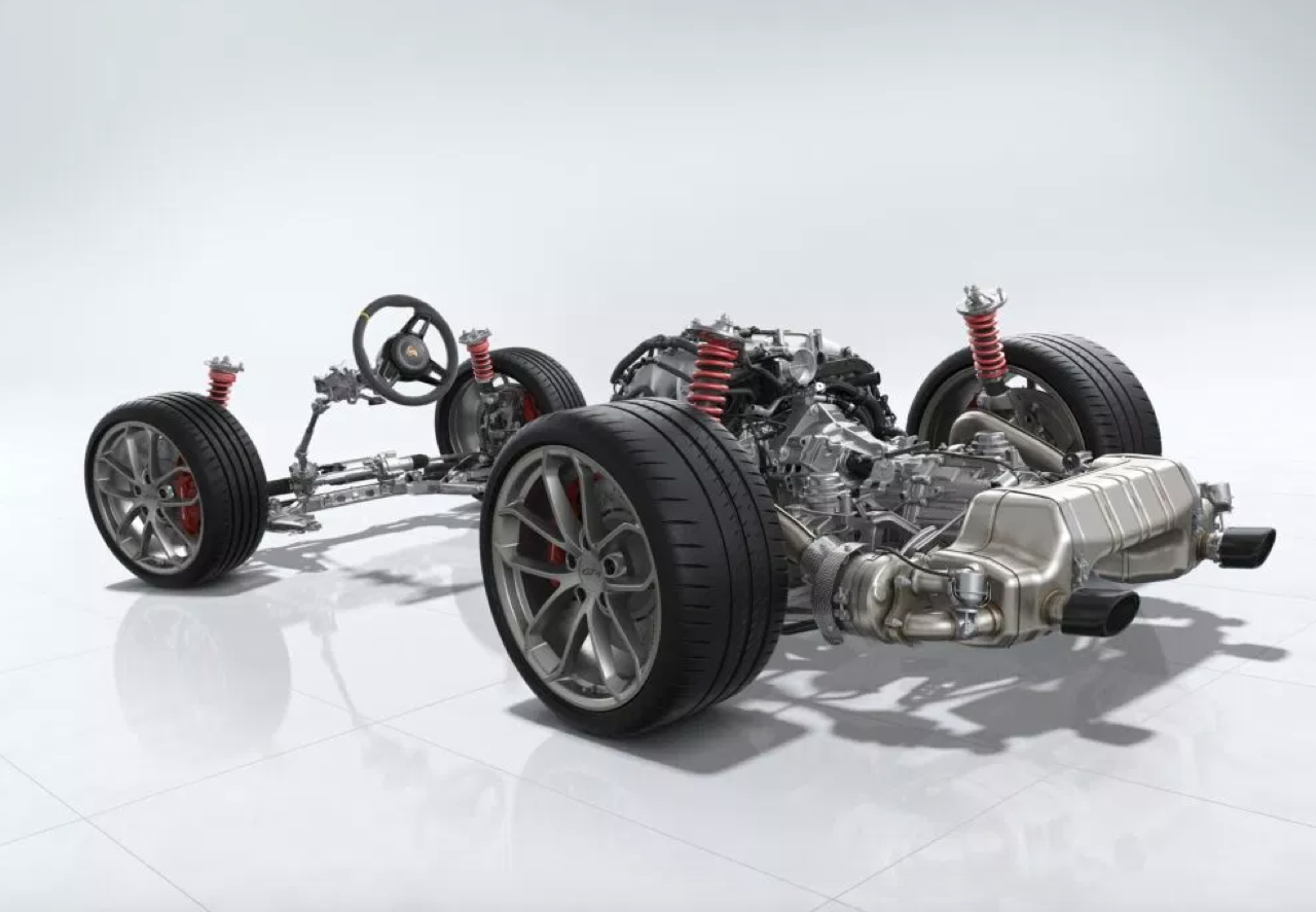 เป็นครั้งแรกของ Porsche 718 Spyder สำหรับการแชร์พื้นฐานของระบบช่วงล่างประสิทธิภาพสูงจากรถแข่งสายพันธุ์แรงของสนามแข่งจีที (GT) จาก 718 Cayman GT4 ระบบรองรับที่ปรับเซ็ตให้เกิดเสถียรภาพและการยึดเกาะ ช่วงล่างถูกจูนอัพใหม่ด้วยชุดสปริงและสตรัทน้ำหนักเบาเทคโนโลยีสนามแข่งทั้งด้านหน้าและด้านหลัง ยึดเข้ากับชิ้นส่วนของช่วงล่างโดยตรงในจุดที่เป็น ball joints ระบบ Porsche Active Suspension Management damping system ลดระดับความสูงของช่วงล่างลงอีก 30 มิลลิเมตร ช่วยให้จุดศูนย์ถ่วงหรือ centre of gravity ต่ำลง ลดอาการโคลงตัวในแนวด้านข้างของตัวรถ งานออกแบบระบบรองรับทั้งหมด เน้นสมรรถนะการขับด้วยความเร็วสูง