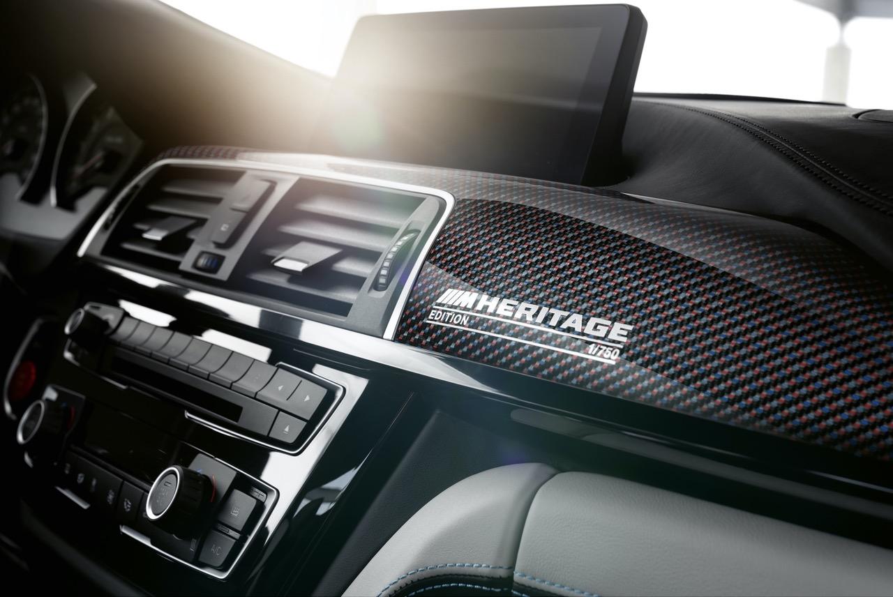 ภายในคุณจะพบเบาะแบบสปอร์ตของรถ M4 ที่สวยงามและตกแต่งใหม่ด้วยการหุ้มหนังสามเฉดสี ดีไซน์ทูโทน และมีช่องเปิดที่โดดเด่นในตัวเบาะ สีของหนังแต่ละที่นั่งจะเติมเต็มสีภายนอกที่เลือกไว้และรวมถึงการเย็บด้วยสีของด้ายที่ตัดกัน เช่น Laguna Seca Blue และ Velvet Blue เบาะนั่งปรับไฟฟ้าจะมาในสีเงิน / สีดำที่มีการเย็บด้วยด้ายสีเทอร์ควอยซ์และกำมะหยี่สีน้ำเงินและสีส้มตามลำดับ ด้วยการตกแต่งภายนอกของ Imola Red เบาะนั่งสีแดงและดำมีการเย็บด้วยด้ายสีเหลืองและแดงแบบโจ่งแจ้งเอาใจวัยแรงที่ชอบของแสบๆ คันๆ ห้องโดยสารมีแถบคาร์บอนตกแต่งภายในโดยออกแบบมาเป็นพิเศษ สำหรับ BMW M4 Edition M Heritage โครงสร้าง CFRP ที่รวมเครื่องหมายแถบริ้วของงานตกแต่งภาย ขอบประตูมีตัวอักษร Edition M Heritage จากหมายเลข 1 ถึง 750 เพื่อบ่งบอกถึงหมายเลขของการผลิตอันน้อยนิดมากๆ