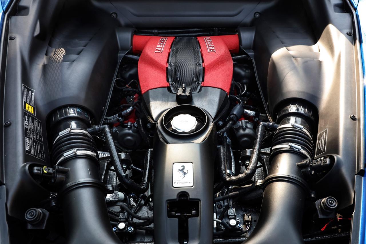 ในโลกแห่งซุปเปอร์คาร์ เครื่องยนต์ V8 ของ Ferrari ถูกขนานนามว่าเป็นขุมพลังที่ดีเลิศทั้งในเรื่องของความดุดันเร้าใจ และจะเด่นชัดมากขึ้นเมื่ออยู่ในรถยนต์สองที่นั่งเครื่องยนต์วางกลางลำ ค่ายม้าลำพองได้รับการยกย่องมากว่า 4 ทศวรรษในฐานะรถยนต์ที่มีแฮนด์ลิ่งสมบูรณ์แบบที่สุด จากการบาลานซ์น้ำหนักที่ยอดเยี่ยม รายละเอียดทางเทคนิคของขุมพลัง V8 เครื่องยนต์ความจุ 3,902 ซีซี. ปลดปล่อยพลังได้ถึง 720 แรงม้า ที่ 8,000 รอบต่อนาที มีอัตราส่วนแรงม้าต่อความจุน่าประทับใจที่ 185 แรงม้าต่อลิตร แรงบิดสูงสุดมีให้ใช้มากขึ้นในทุกๆ ย่านความเร็วของรอบเครื่องยนต์ และพีคสุดที่ 770 นิวตันเมตร ที่ 3,250 รอบต่อนาที
