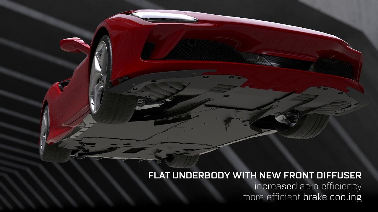 F8 Spider มีระบบอากาศพลศาสตร์หรือแอโรไดนามิกส์ล้ำสมัย เกิดจากประสบการณ์การสร้างรถแข่ง GT และ Challenge ของ Ferrari หลอมรวมสิ่งเหล่านี้เข้ากับรถเปิดประทุนเครื่องยนต์วางกลาง ก่อกำเนิดซุปเปอร์คาร์สมรรถนะสูงที่ควบคุมได้ง่ายขึ้น ตำแหน่งของแผงระบายความร้อนใน F8 Spider แตกต่างออกไปจากรุ่น 488 Spider ทำมุมเอียงไปทางด้านหลัง ส่งผลดีต่อการระบายความร้อน ช่วยลดการสูญเสียพื้นที่บริเวณใต้ท้องรถ ซึ่งสามารถนำไปใช้ในการสร้างดาวน์ฟอร์ซ รูปทรงของช่องที่ใช้ในการกระจายลมร้อนถูกออกแบบใหม่ให้สร้างดาวน์ฟอร์ซได้สูงสุดโดยไม่เกิดแรงต้าน ช่วยเพิ่มประสิทธิภาพโดยรวมของรถ 10 เปอร์เซ็นต์ เมื่อเทียบกับ 488 Spider
