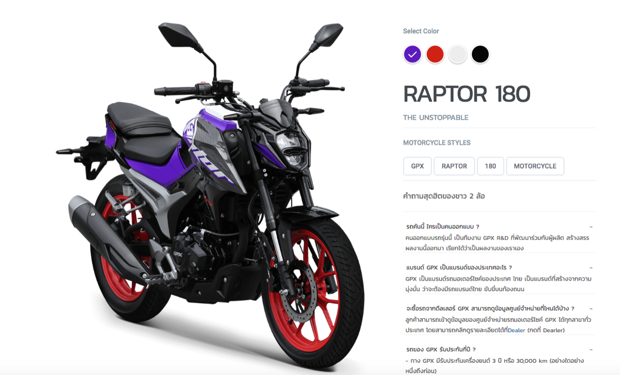 GPX RAPTOR 180 มีทั้งหมด 4 สี ได้แก่ สีม่วง สีแดง สีดำ สีขาว ราคา 59,500 บาท.
