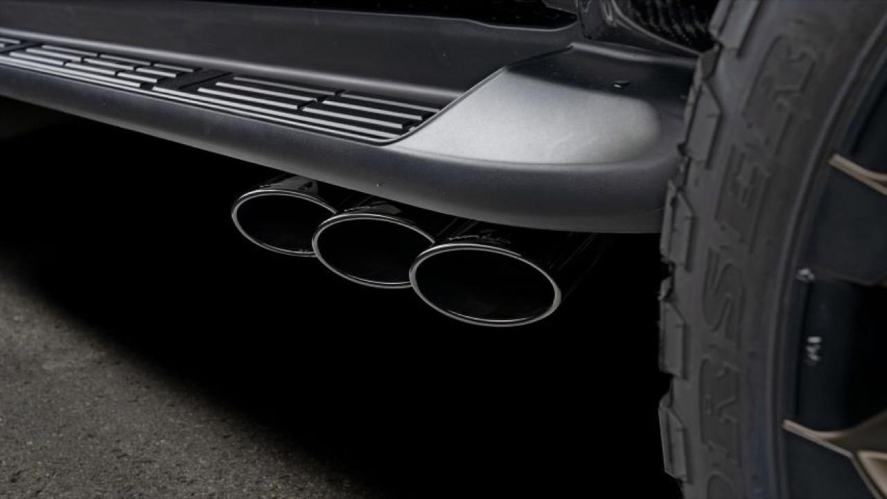 ด้านข้างบริเวณใต้กาบบันไดใกล้ซุ้มล้อหลังติดตั้งท่อระบายไอเสียจำนวนสามท่อทรงกลมสไตล์รถแรงของอเมริกันด้วยการตีท่อออกด้านข้างอย่างโหดที่โผล่ขึ้นมาด้านหน้าของซุ้มล้อหลังในแต่ละด้านฝั่งละสามท่อ งานออกแบบดังกล่าวได้รับแรงบันดาลใจจาก Mercedes-AMG G63