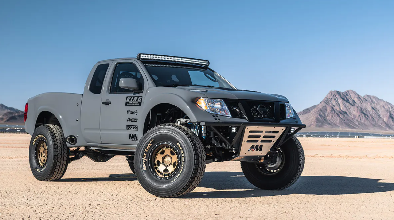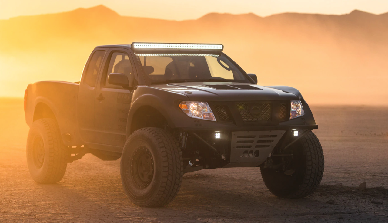 Navara Desert Runner ใส่บังโคลนโหดๆ ของ Fiberworx Pre Runner ชุดกันชนหน้าและหลังใหม่หมด ระบบส่องสว่างเต็มอัตราศึกด้วยชุดไฟ LED ของ Rigid Industries ชุดตกแต่งภายนอก Speed Designs ทำให้การตกแต่งภายนอกเสร็จสมบูรณ์