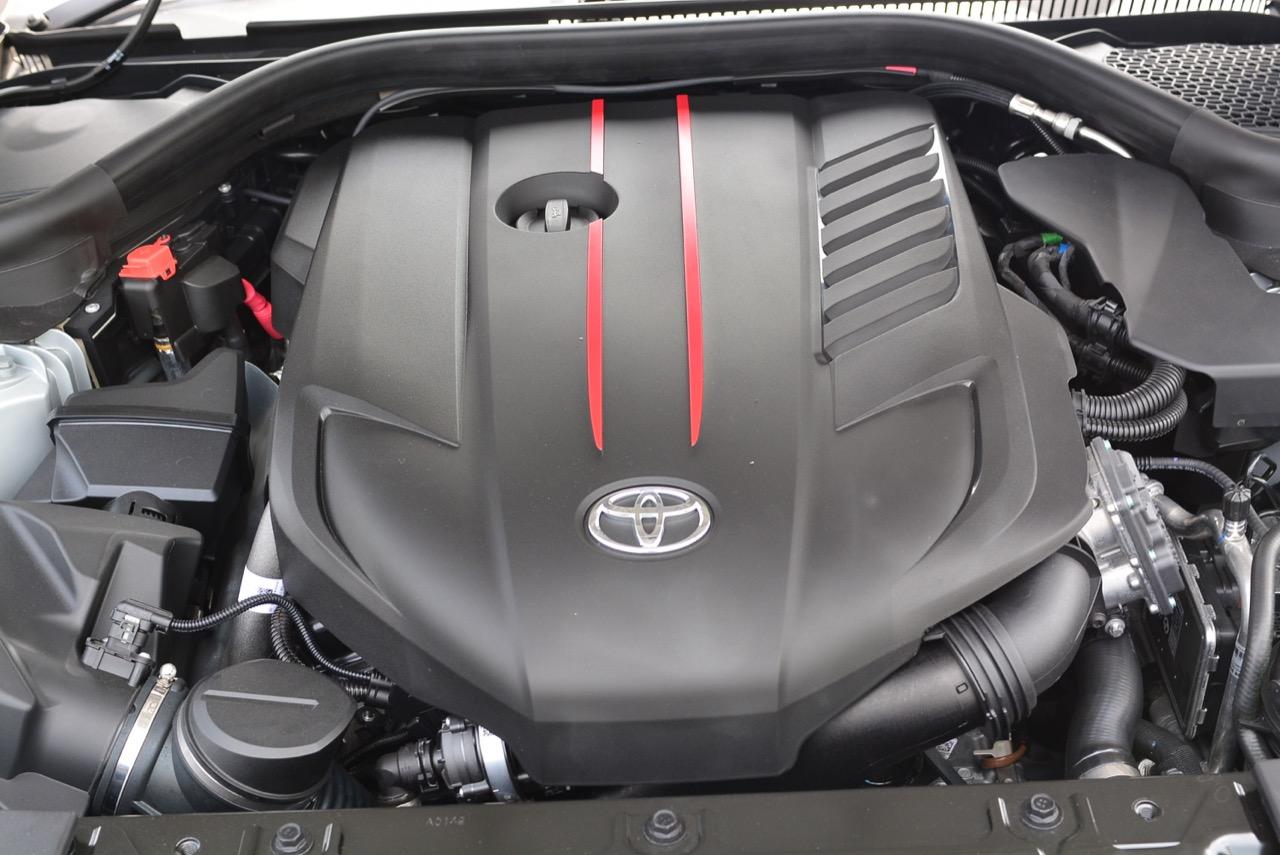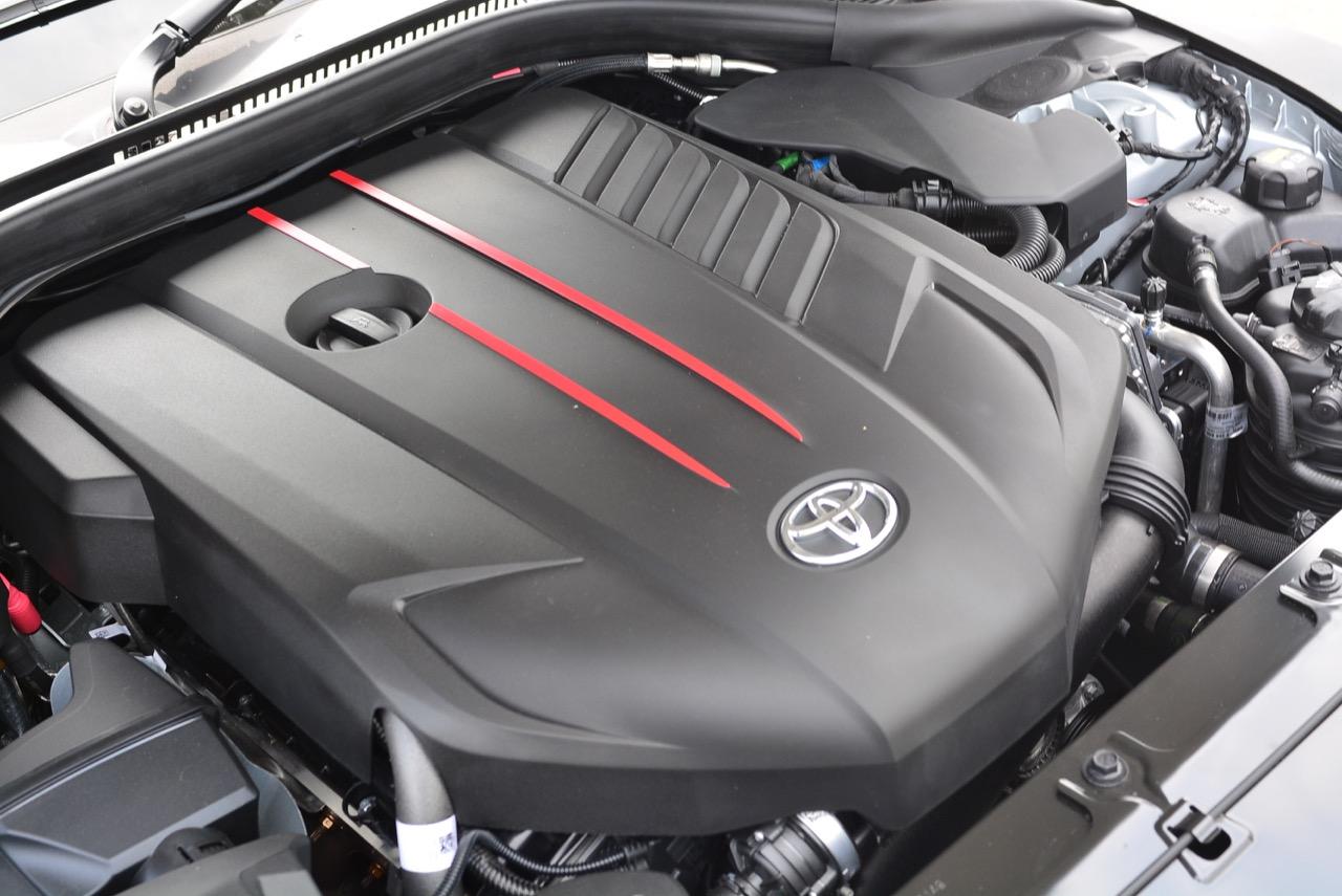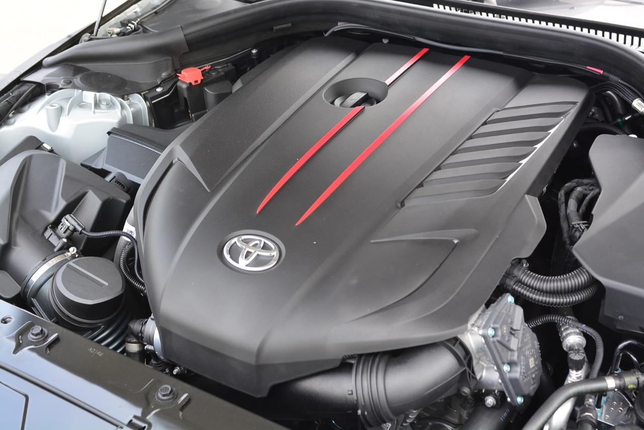 Toyota GR Supra ติดตั้งเครื่องยนต์เบนซินแบบ 6 สูบเรียง เป็นเครื่องยนต์รุ่นเดียวกับ BMW Z4 M40i มาพร้อมเทคโนโลยี TwinPower Turbo อัดอากาศด้วยเทอร์โบแปรผันเดี่ยวตัวเดียวโดดๆ Twin Scroll Turbo ระบบส่งกำลังใช้เกียร์อัตโนมัติ 8 สปีด ของ ZF กำลังถูกจูนจนมีม้าพอให้ได้เสียวสันหลังที่ 340 ตัว แรงม้าของ GR Supra เมื่อจับขึ้น Dyno test มากกว่า Z4 M40i นิดๆ แรงบิดสูงสุดทำได้ถึง 500 นิวตันเมตร หรือ 50.1 กิโลกรัม-เมตร ที่ 4,000-5,380 รอบต่อนาที อัตราสิ้นเปลืองเฉลี่ย 8.4 ลิตรต่อระยะทาง 100 กม. (11.9 กิโลเมตรต่อลิตร) อัตราเร่ง 0-100 กิโลเมตรต่อชั่วโมงใน 4.6 วินาที และ 80-120 กิโลเมตรต่อชั่วโมง ในเวลา 5 วินาที ความเร็วสูงสุด 250 กิโลเมตรต่อชั่วโมง เครื่องยนต์ 6 สูบเรียงวางตามยาวโดยร่นแท่นเครื่องแท่นเกียร์ให้เข้าใกล้กับจุดศูนย์กลางของรถเพื่อการกระจายน้ำหนักที่ดี เครื่องยนต์ 6 สูบเทอร์โบเดี่ยว ติดตั้งอินเตอร์คูลเลอร์เพื่อช่วยลดอุณหภูมิไอดี ทำให้ GR Supra เป็นรถที่เร็วอย่างน่ากลัว และต้องใช้ความคุ้นเคยกันพอสมควรก่อนจะคิดปล่อยม้า 340 ตัวลงพื้นแบบเต็มๆ