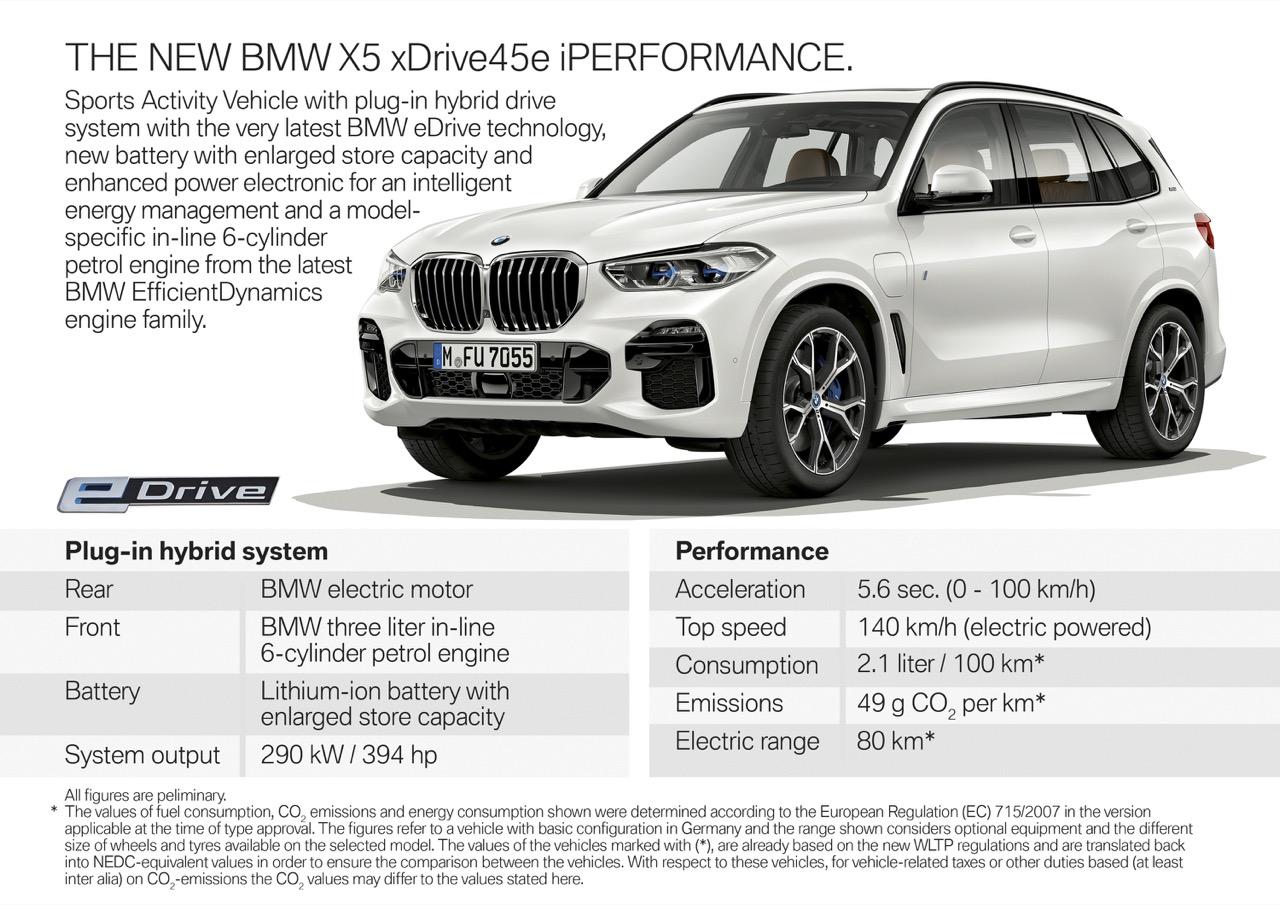 เจเนอเรชั่นที่ 2 ของ BMW New X5 ในรูปแบบปลั๊กอินไฮบริดผสานขุมพลังการขับเคลื่อนระบบไฟฟ้าเข้ากับความคล่องตัวในแบบฉบับรถยนต์ Sports Activity Vehicle (SAV) BMW X5 xDrive45e M Sport ใหม่ มีอัตราการสิ้นเปลืองเชื้อเพลิงที่ 43.5 กิโลเมตรต่อลิตร ตาม ECO Sticker โดยเมื่อขับเคลื่อนด้วยไฟฟ้าเพียงอย่างเดียว จะสามารถทำความเร็วสูงสุดที่ 135 กิโลเมตรต่อชั่วโมง จากเดิมสูงสุดที่ 120 กิโลเมตรต่อชั่วโมง และวิ่งด้วยไฟฟ้าได้ไกลสูงสุด 67-87 กิโลเมตรตามมาตรฐานการทดสอบ WLTP ของยุโรป