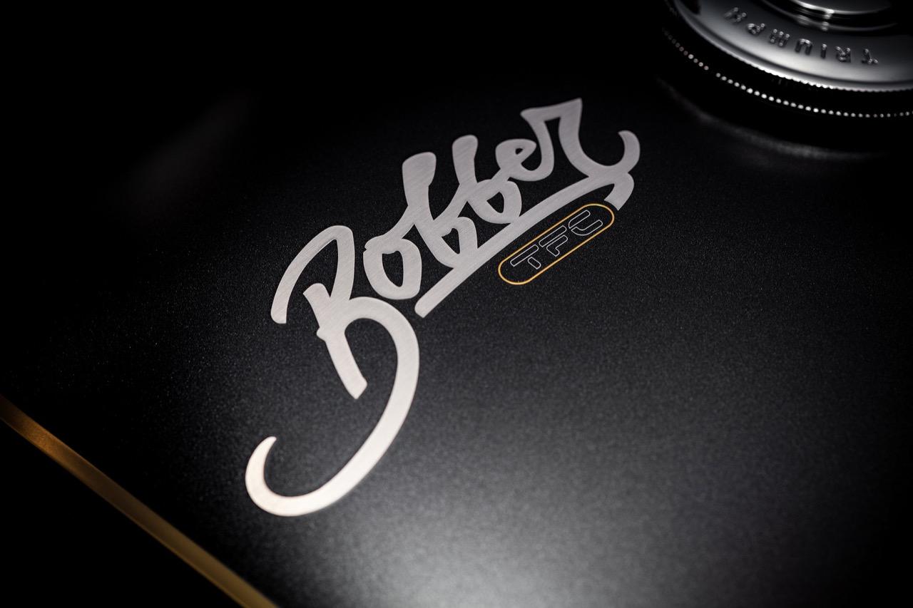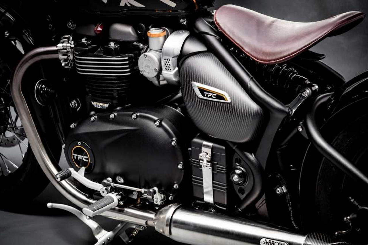 ล้อซี่ลวดชุบอะลูมิเนียมสีดำสุดพรีเมี่ยม สปริงของระบบกันการสั่นสะเทือนของล้อหลัง Öhlins และโช้คคู่ของ Öhlins เช่นกัน ฝาครอบเครื่องยนต์สีดำ โครงรถและสวิงอาร์มสีดำ เพื่อเติมเต็มธีมสีดำ และความเป็นเส้นใยคาร์บอนแท้ รถรุ่น Bobber TFC มีสีพรีเมี่ยมอันเป็นเอกลักษณ์ สี Carbon Black และ Matt Carbon Black สุดโดดเด่น และยังติดธงสัญลักษณ์อังกฤษประดับด้วยฟอยล์สีเงินบริเวณที่รองเข่า ดีคอล Bobber ตกแต่งด้วยการขัดเงา พร้อมตราสัญลักษณ์ไทรอัมพ์ที่ติดอยู่บนตัวถัง ในขณะที่ถังน้ำมันจะมีลายขวางสีทอง และลงรายละเอียดด้วยสีทองไปทั่วทั้งตัวรถ ตั้งแต่ป้ายตราสัญลักษณ์ ผิวหน้าของอุปกรณ์ กุญแจ สายโซ่สีทองสไตล์คัสตอม Bobber TFC ยังคงลักษณะการออกแบบที่ครอบแบตเตอรี่ พร้อมกับสายรัดทำจากแสตนเลส ดุมล้อออกแบบคล้ายดรัมเบรก บังโคลนหลัง คอยล์จุดระเบิดบริเวณด้านหน้าของแผงรถฝั่งขวา กระจกมองข้าง และฝาถังน้ำมันติดตราแบบล็อกได้