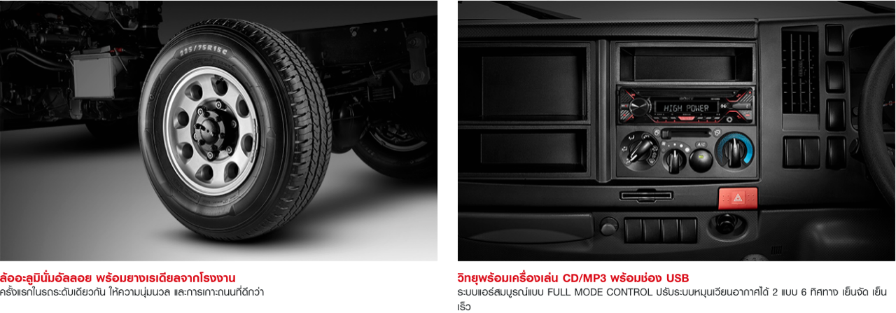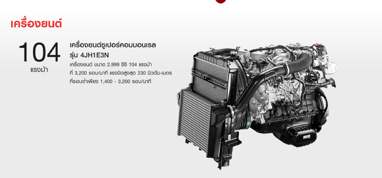 เครื่องยนต์ซุปเปอร์คอมมอนเรล รุ่น 4JH1E3N เป็นเครื่องยนต์ดีเซลขนาด 2,999 ซีซี ให้กำลังสูงสุด 104 แรงม้า ที่ 3,200 รอบต่อนาที แรงบิดสูงสุด 230 นิวตัน-เมตร ที่ 1,400 – 3,200 รอบต่อนาที ระบบส่งกำลังติดตั้งเกียร์ Isuzu รุ่น MSB5S เป็นเกียร์ธรรมดา 5 เกียร์เดินหน้า พร้อมโอเวอร์ไดรฟ์ ล้ออะลูมิเนียมอัลลอย พร้อมยางเรเดียลแบบไม่มียางในจากโรงงาน วิทยุพร้อมเครื่องเล่น CD/MP3 พร้อมช่อง USB