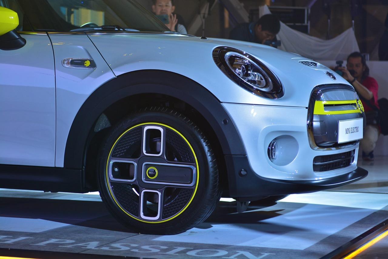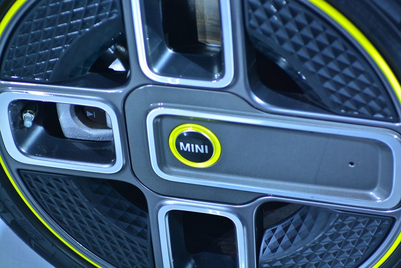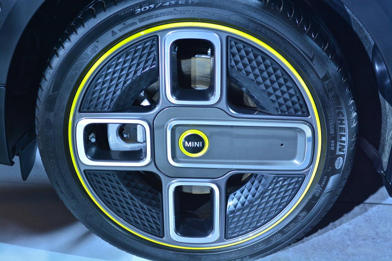 ใต้ท้องรถที่มีแผ่นปิดเกือบรอบคัน และกระโปรงท้ายรถในรูปลักษณ์สะดุดตา ล้วนมีส่วนช่วยลดแรงต้านของอากาศ ซึ่งเมื่อปราศจากท่อไอเสีย อากาศจึงสามารถไหลผ่านใต้ท้องรถไปยังท้ายรถ เสริมประสิทธิภาพด้านอากาศพลศาสตร์ด้วยล้ออัลลอยน้ำหนักเบาขนาด 17 นิ้ว ลาย MINI Electric Corona พร้อมยางรันแฟลต