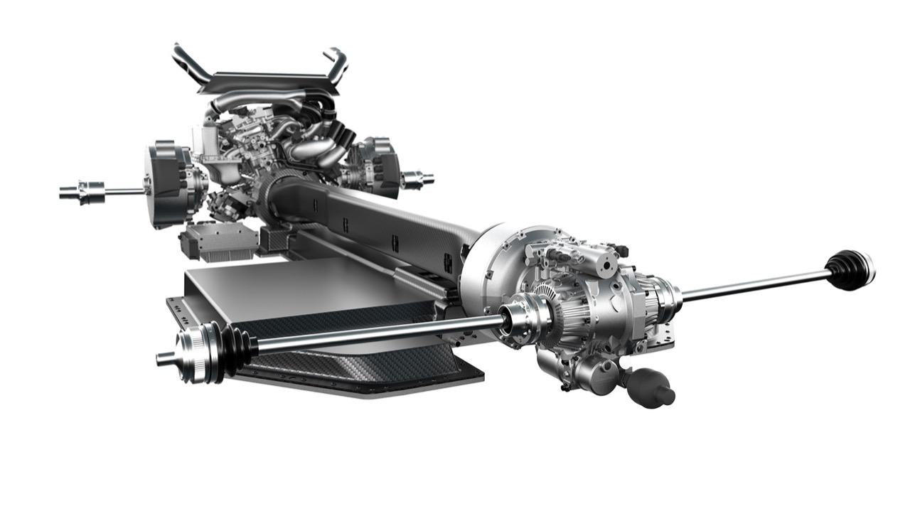 มอเตอร์ไฟฟ้าสามตำแหน่ง ตัวแรกติดตั้งเชื่อมต่อกับเพลาข้อเหวี่ยงของเครื่องยนต์ มีกำลัง 400 แรงม้า แรงบิด 500 นิวตันเมตร มอเตอร์ตัวแรกที่ติดกับเครื่องรับหน้าที่ส่งแรงบิดไปที่ล้อคู่หน้าด้วยชุดเกียร์ Single-speed Direct-drive พร้อมระบบควบคุมแรงบิดอิเล็กทรอนิกส์ Torque Vectoring Control