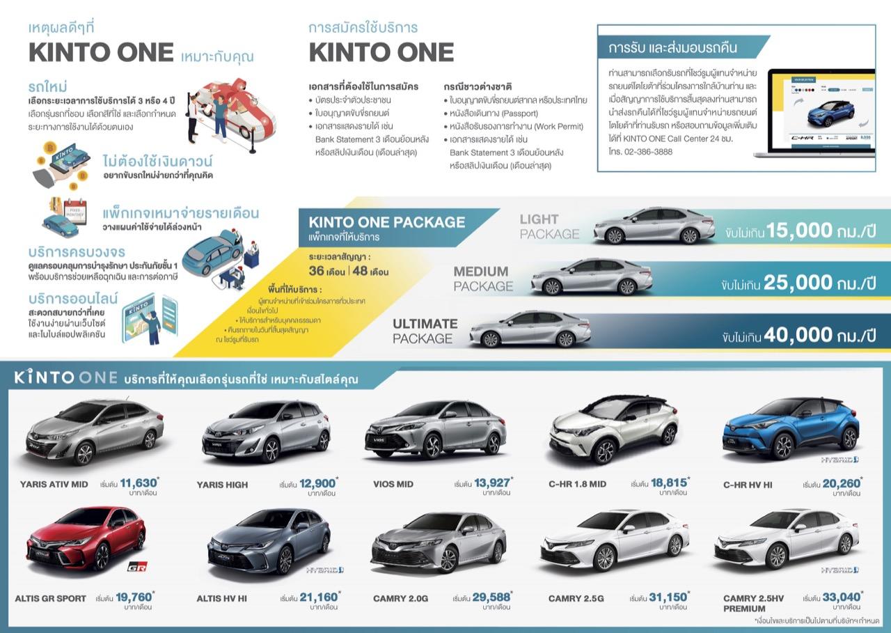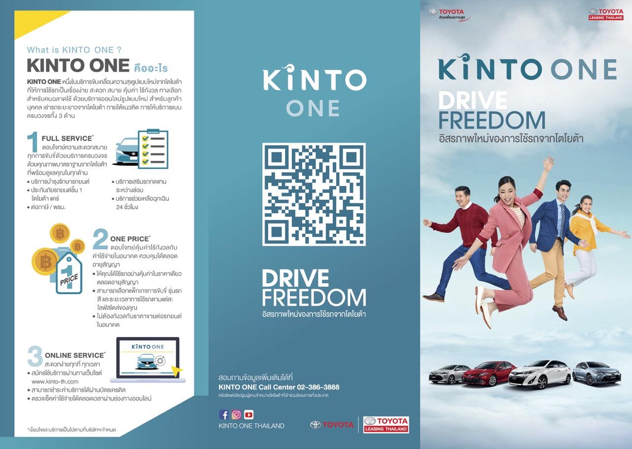 บริการ KINTO ONE เป็นความร่วมมือระหว่าง Toyota Motor Thailand และ Toyota Leasing Thailand ภายใต้วัตถุประสงค์ที่จะอำนวยความสะดวกให้กับลูกค้า นำเสนอทางเลือกใหม่ จากการเช่าซื้อรถปกติ (Hire purchase) เป็นการเช่าใช้รถในระยะยาว (KINTO ONE) ที่จะได้รับประโยชน์มากขึ้น