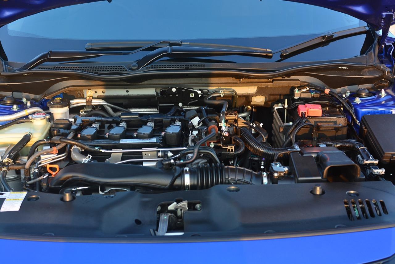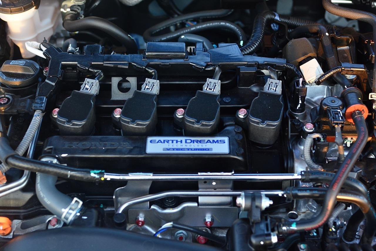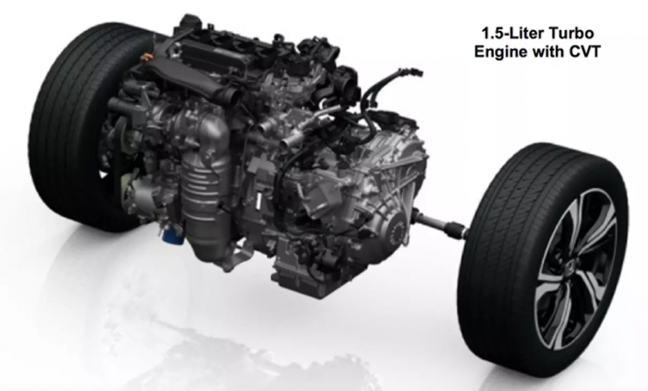 เครื่องยนต์ 1.5 ลิตร เทอร์โบบล็อกล่าสุดของ Honda ใช้ชุดเพลาราวลิ้นพร้อมระบบ Dual-VTC เพียงแค่ระบบเดียว โดยระบบจะแปรผันวาล์วทั้งสองฝั่ง (ฝั่งไอดีและฝั่งไอเสีย) โดยไม่ต้องใช้ระบบ VTEC เนื่องจากใช้ระบบอัดอากาศเทอร์โบเดี่ยวแบบ Mono Scroll พร้อมเวสเกตแบบไฟฟ้า Electrical Waste - gate ชุดเทอร์โบและเวสเกตเป็นแบบไฟฟ้าทั้งหมด เพื่อทำให้เครื่องยนต์ตอบสนองการระบายแรงดันส่วนเกินที่รวดเร็วสอดรับกับการทำงานของระบบวาล์วแปรผัน Dual VTC ในทุกจังหวะและทุกช่วงเวลาของการปิด-เปิดวาล์วไอดีและไอเสีย เทอร์โบตัวเล็กสร้างแรงบูสได้สูงสุดที่ 16.5 psi เครื่องยนต์เทอร์โบขนาด 1.5 ลิตร เค้นกำลังสูงสุดออกมาได้ 174 แรงม้า ที่ 5,500 รอบต่อนาที แรงบิดสูงสุด 220 นิวตันเมตร ที่ 1,800-5,500 รอบต่อนาที ระบบส่งกำลังหันมาคบหากับเกียร์สายพานพูเลย์ CVT เพื่อทำให้อัตราสิ้นเปลืองเชื้อเพลิงดีขึ้น เกียร์ CVT อัตราทดแปรผันยัดแป้นเปลี่ยนเกียร์ Paddle Shift มาให้สับเกียร์เล่นอีกต่างหาก ตัวเลขอัตราสิ้นเปลืองน้ำมันเชื้อเพลิงที่ Honda เคลมมาให้อยู่ที่ 13-14 กิโลเมตรต่อลิตร (นอกเมือง) ใกล้เคียงกับอัตราสิ้นเปลืองของเครื่อง 2 ลิตร ใน Civic รุ่นที่ผ่านมา สำหรับมาตรฐานมลพิษของเครื่อง 1.5 ลิตร เทอร์โบอยู่ในระดับ EURO-6 มีทั้งความสะอาดและประหยัดควบคู่กันไป