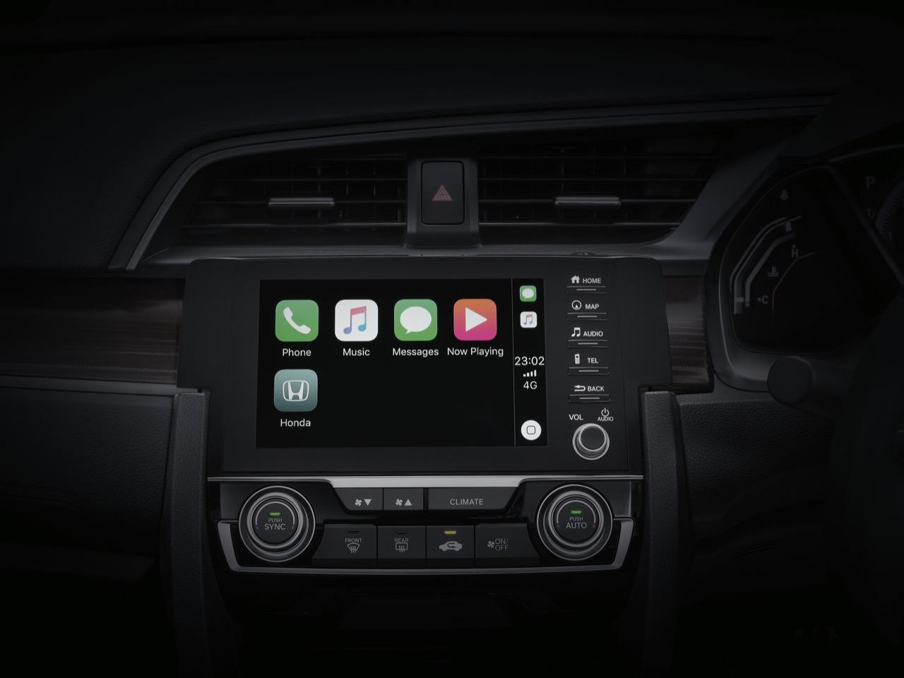 ภายในของ Honda Civic รุ่น TURBO RS ติดตั้งระบบปรับอุณหภูมิอัตโนมัติแบบปรับอุณหภูมิแยกอิสระซ้าย-ขวา ระบบเครื่องเสียงหน้าจอสัมผัสขนาด 7 นิ้ว แบบ Advanced Touch รองรับการเชื่อมต่อ Apple CarPlay ระบบสั่งการด้วยเสียง Siri
