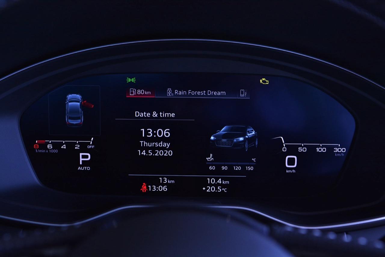 มาตรวัดแบบใหม่ใช้จอแสดงข้อมูลการขับขี่แบบ TFT LCD Virtual cockpit plus ขนาดใหญ่ถึง 12.3 นิ้ว พร้อมระบบเครื่องเสียงระดับพรีเมียมจากแบรนด์ดังระดับโลก Bang & Olufsen ไฟภายในห้องโดยสารของ The New Audi A5 Coupé 45 TFSI quattro S line Black Edition เป็นไฟเรืองแสงแบบปรับสีได้ (Contour / ambient lighting) มีให้เลือก 30 สี