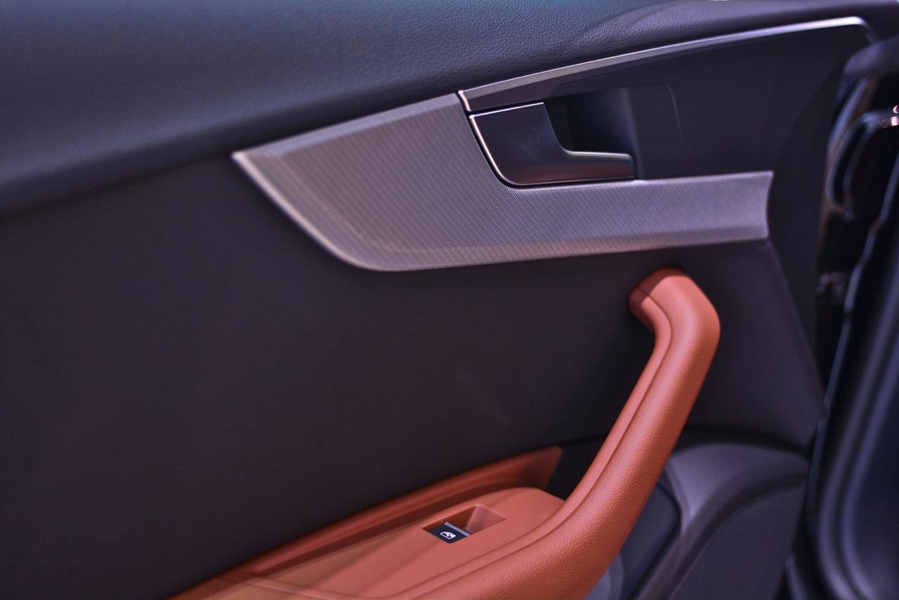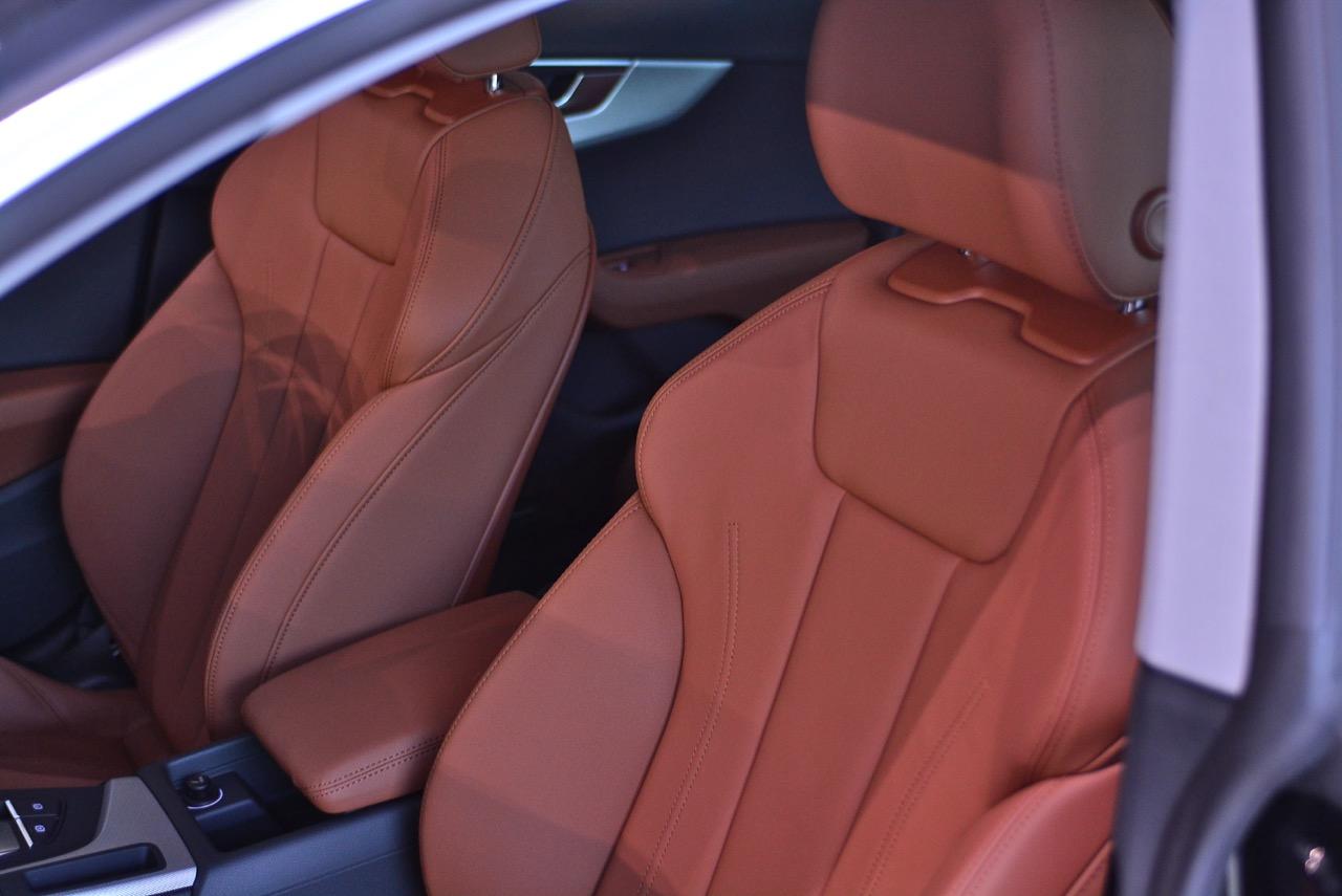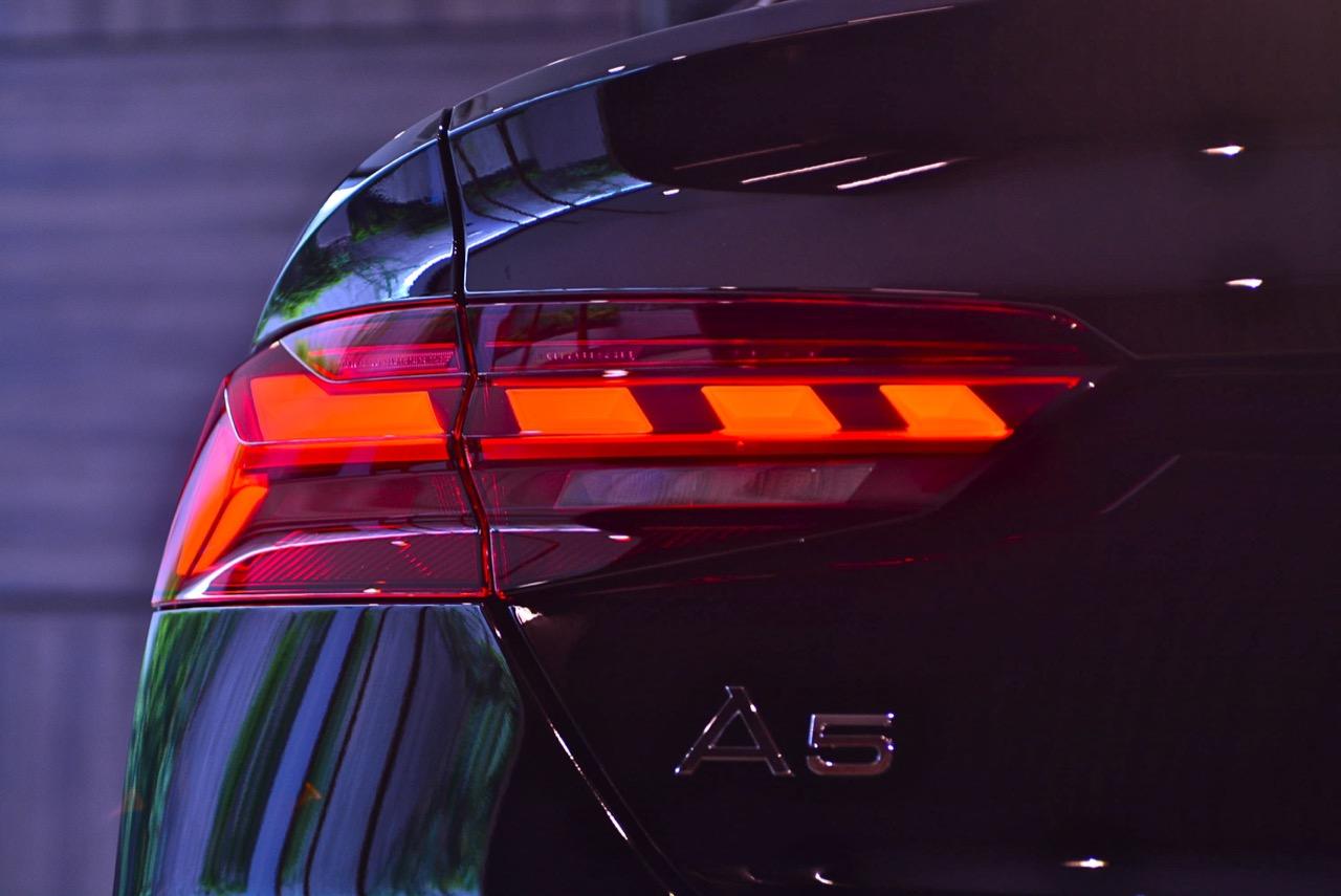 ล้ออัลลอยลายสวยของ S-Line ขนาด 19” x 8.5J กับยางสปอร์ตราคาแพงจาก Bridgestone รุ่น Potenza s001 ไซส์ 255/35/R19 96Y ทั้งสี่ล้อ แก้มข้างประทับตรา S-Line เพื่อโชว์ตัวตนที่แท้จริงว่าเป็น A5 รุ่นตกแต่งพิเศษด้วยอุปกรณ์เสริมความหล่อจาก Audi แนวด้านข้างตัวรถดูแข็งแกร่ง บั้นท้ายหนาบึกด้วยทรงของฝาท้ายกับไฟท้ายแบบ LED ที่ค่อนข้างลงตัว ท่อระบายไอเสียทรงเหลี่ยมแบบแยกฝั่งกับล้อขนาดใหญ่ทำให้มันดูโหด แทนที่จะทำตัวเป็นผู้ดีเหมือน New E Coupe หรือ BMW Series-4 แต่ New Audi A5 กลับเอาใจนักเลงรถด้วยทรงเหลี่ยมที่สอดรับกันทั่วทั้งคันอย่างลงตัว ดูดิบๆ สีเขียวแบบใหม่ล่าสุดช่วยเสริมให้ตัวถังของมันดูคมเข้มมากเป็นพิเศษ เทรนด์แฟชั่นสีตัวถังแบบใหม่ District Green หรือสีเขียวทหารพราน ตัดกับคาลิปเปอร์เบรกสีแดงหน้า-หลัง