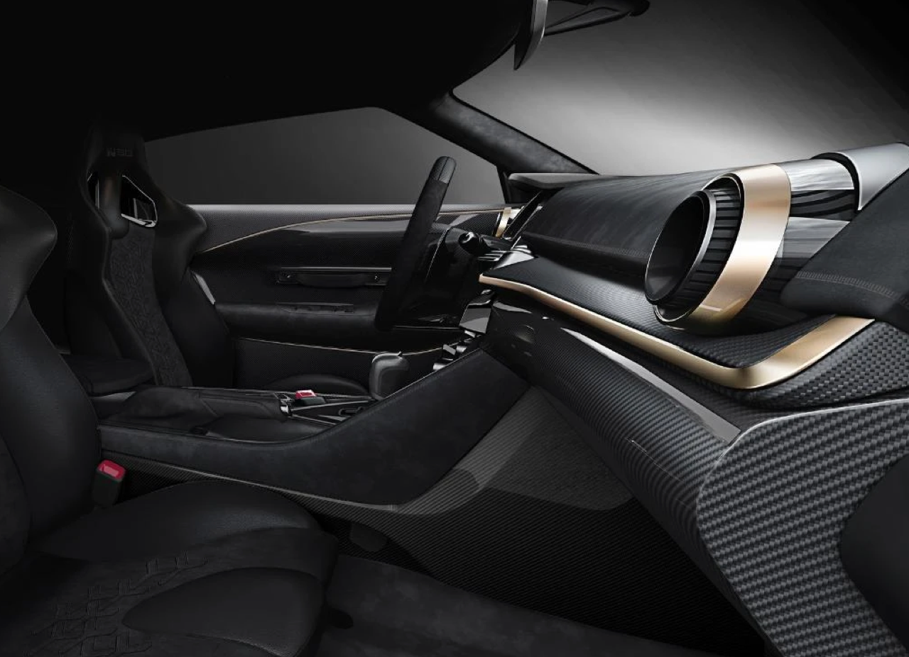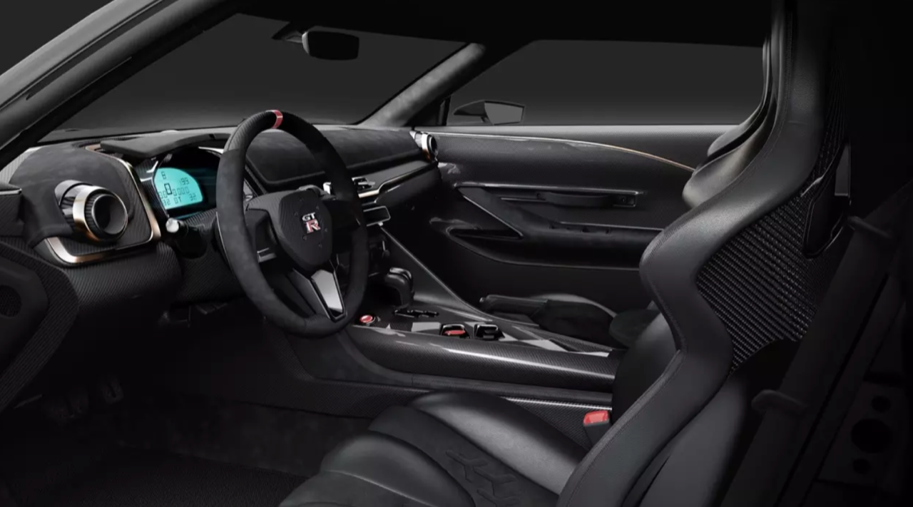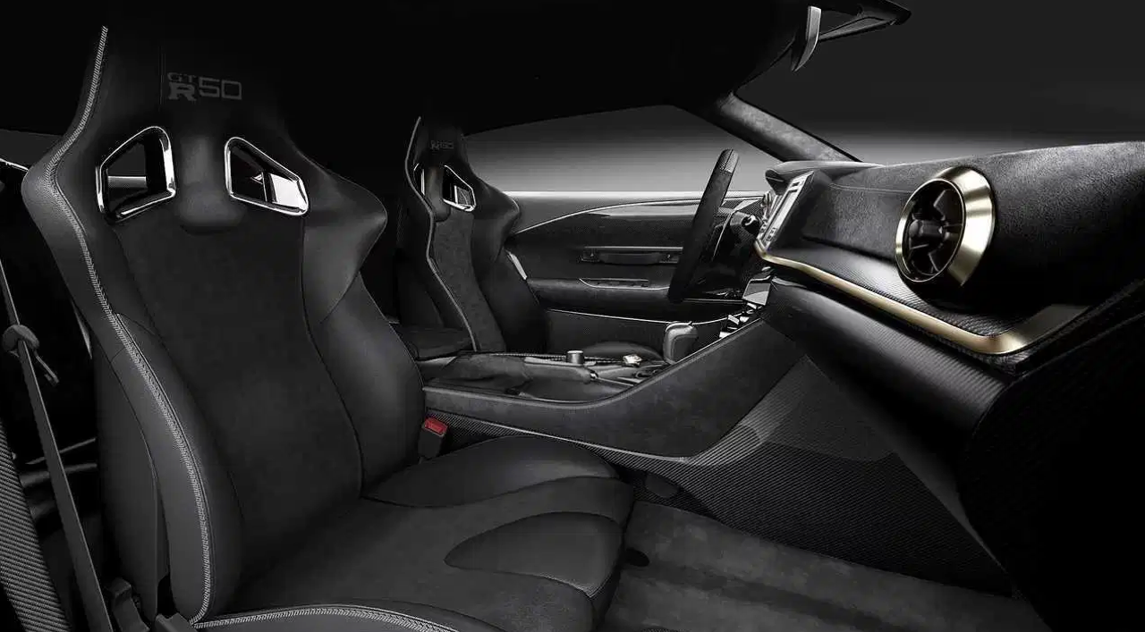 สำหรับภายในของ GT-R 50 Italdesign ออกแบบให้สื่อถึงความทันสมัย มีประสิทธิภาพสูง ด้วยวัสดุคาร์บอนไฟเบอร์สองชนิดที่แตกต่างกันไป เต็มบริเวณแผงคอนโซลกลาง แผงหน้าปัดและวัสดุที่ใช้บุพื้นผิว รวมถึงวัสดุอัลคานทารา (Alcantara) สีดำและเบาะนั่งหนังแท้จากอิตาลีสีดำ พร้อมการตกแต่งด้วยวัสดุสีทอง ในโทนเดียวกับรูปลักษณ์ภายนอก บริเวณแผงหน้าปัดประตูและสวิตช์ต่างๆ ที่ได้รับแรงบันดาลใจจากรถในอนาคต ขณะที่พวงมาลัยที่ทำขึ้นเฉพาะที่บริเวณแกนกลางและวงพวงมาลัยทำจากคาร์บอนไฟเบอร์ โดยหุ้มด้วยวัสดุอัลคานทารา
