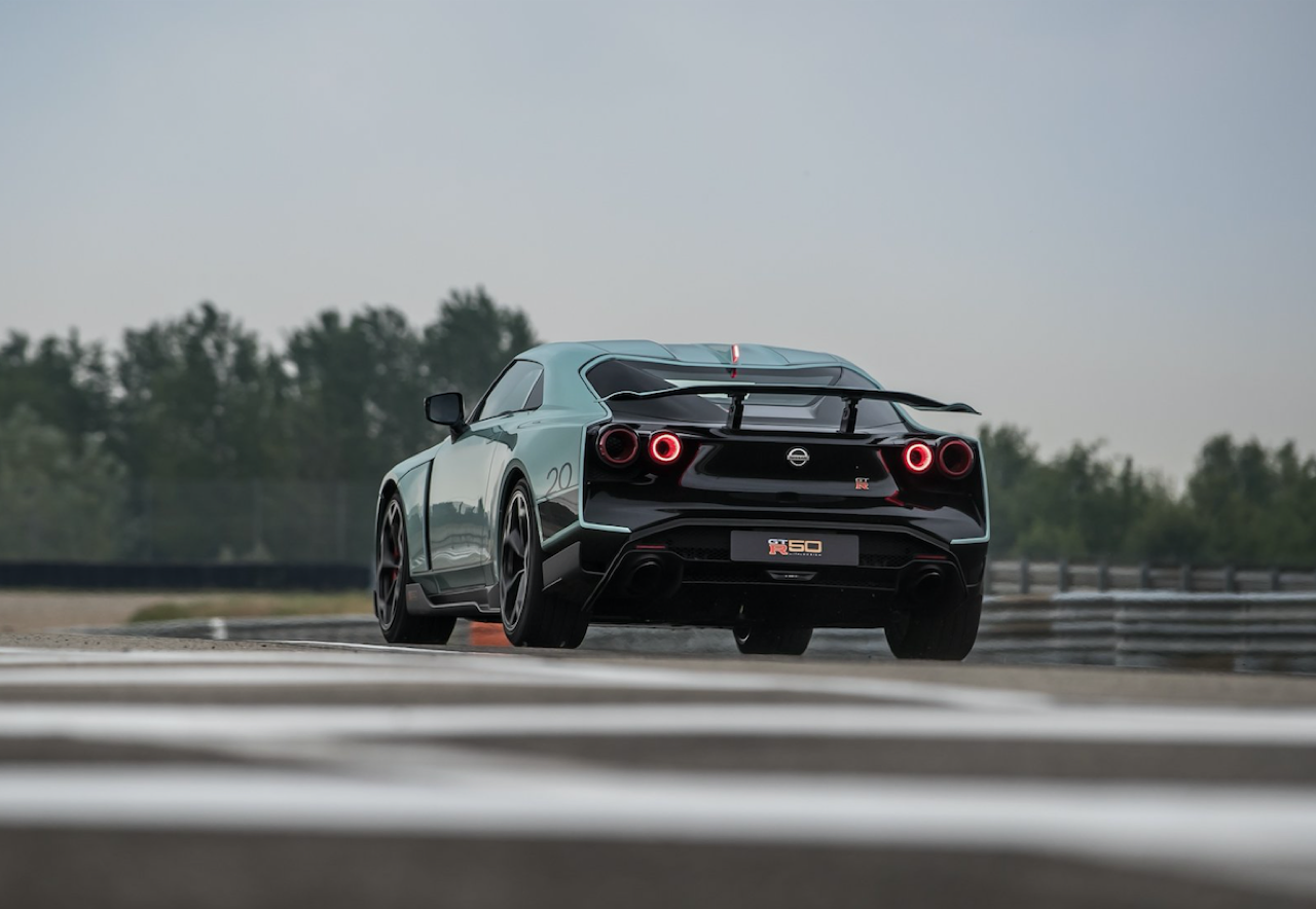 ด้านหลังของตัวรถ ถูกเสริมความกว้างเพื่อขยายแทร็ก รวมไปถึงเส้นสายที่ให้ความแข็งแกร่งรอบๆ ล้อ สายข้างที่ลู่ลงบริเวณหน้าต่างด้านหลังถูกดึงเข้าหาจุดกึ่งกลางของฝากระโปรงท้าย ด้วยการออกแบบที่น่าทึ่งนี้ ทำให้หน้าต่างด้านหลังจะมีระยะที่ยาวขึ้นและลึกกว่ารถรุ่นมาตรฐาน ไฟท้ายทรงกลมคู่เอกลักษณ์ของ GT-R ได้รับการขยายให้ลอยตัว และแยกห่างกัน จากการใช้วงแหวนบางๆ และปรับลดส่วนกลางให้ลึกลง ติดตั้งบริเวณมุมนอกและตรงกลางของฝาท้ายด้านหลัง ขณะที่ปีกหลังขนาดใหญ่ที่ปรับองศาได้ถูกติดตั้ง เสริมความดุดัน ล้ออัลลอยแบบใหม่ถูกออกแบบเป็นพิเศษ ล้อหน้าขนาด 10 x 21 นิ้ว ส่วนล้อหลังเล่นใหญ่มากถึง 10.5 x 21 นิ้ว มาพร้อมสี Liquid Kinetic Grey ระบบบเบรก ติดตั้งจานเบรกคาร์บอนเซรามิก พร้อมคาร์ลิปเปอร์เบรกหน้าแบบ 6 พอต ส่วนคาร์ลิปเปอร์หลังเป็นแบบ 4 พอต