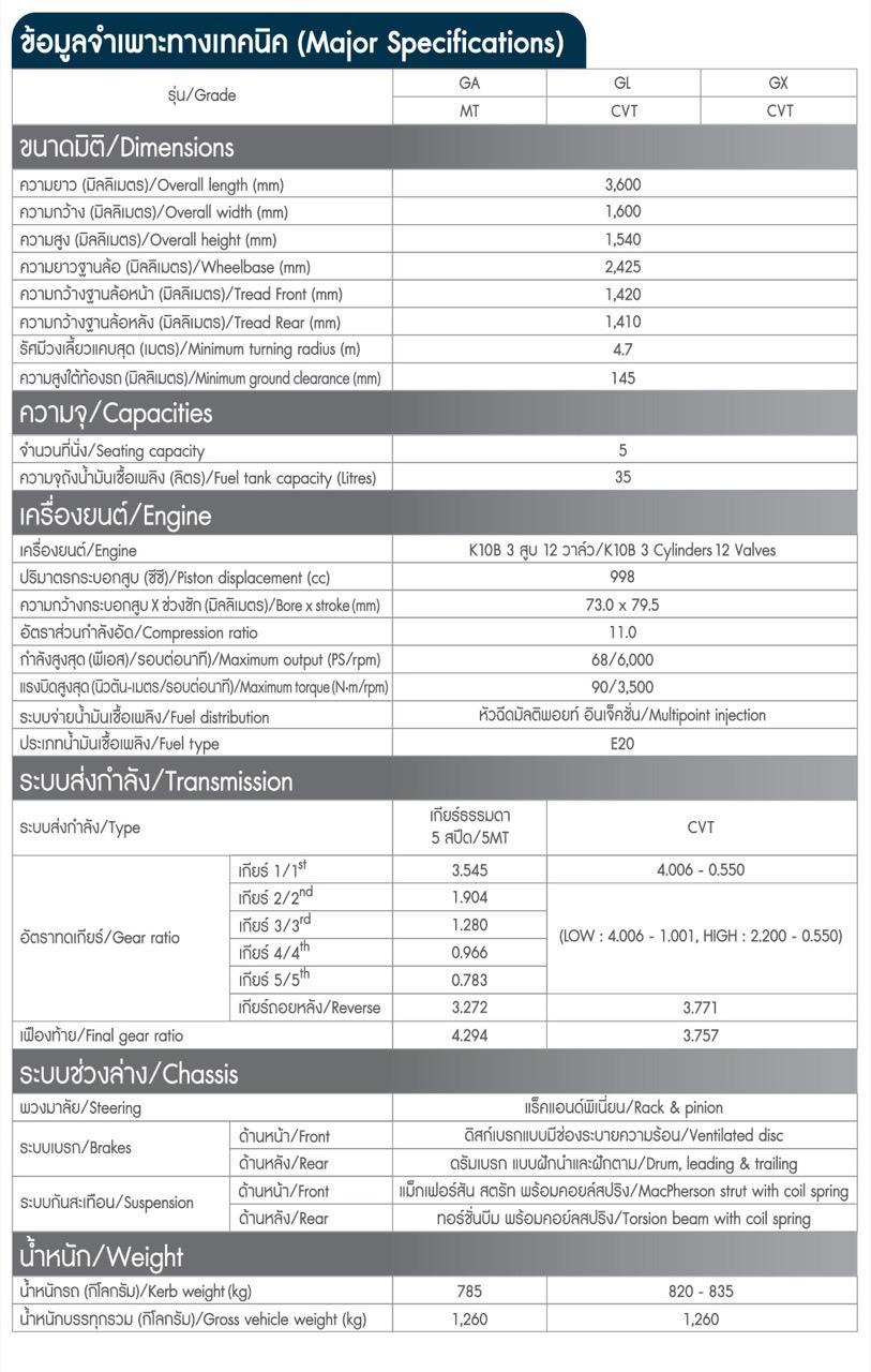 เครื่องยนต์ออกแบบมาเพื่อการขับใช้งานในชีวิตประจำวัน มีความสามารถเกินตัว ให้สมรรถนะการขับที่ดี ประหยัดน้ำมันเชื้อเพลิงมากกว่า 20 กิโลเมตรต่อลิตร ปล่อยมลพิษต่ำและเป็นมิตรกับสิ่งแวดล้อม เครื่องสามกระบอกสูบ K10B ปริมาตรความจุกระบอกสูบ 998 ซีซี 12 วาล์ว อัตราส่วนกำลังอัด 11.0:1 จ่ายเชื้อเพลิงด้วยหัวฉีดไฟฟ้าแบบมัลติพอยท์ รองรับเชื้อเพลิง E20 ให้กำลัง 50 กิโลวัตต์ หรือ 68 แรงม้าที่ 6,200 รอบต่อนาที แรงบิดสูงสุด 90 นิวตันเมตร ที่ 3,500 รอบต่อนาที อัตราเร่งจาก 0-100 กิโลเมตรใน 13.4 วินาที ความเร็วสูงสุด 150 กิโลเมตรต่อชั่วโมง ระบบส่งกำลังใช้เกียร์แบบสายพาน CVT ระบบบังคับเลี้ยวเป็นพวงมาลัยแบบแรคแอนพีเนียน ช่วงล่างด้านหน้าแมคเฟอร์สันสตรัท สปริง โช้คอัพและเหล็กกันโคลง ส่วนด้านหลังเป็นแบบทอร์ชั่นบีม เบรกหน้าแบบดิสก์เบรกจานเหล็กพร้อมครีบระบายความร้อน เบรกหลังแบบดรัมเบรก