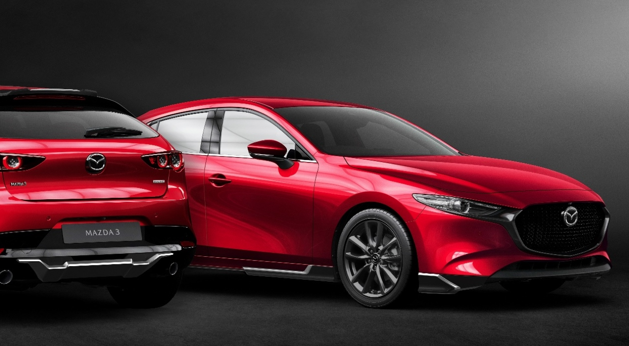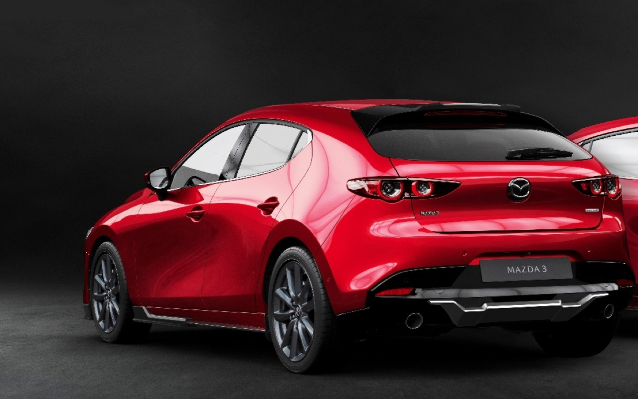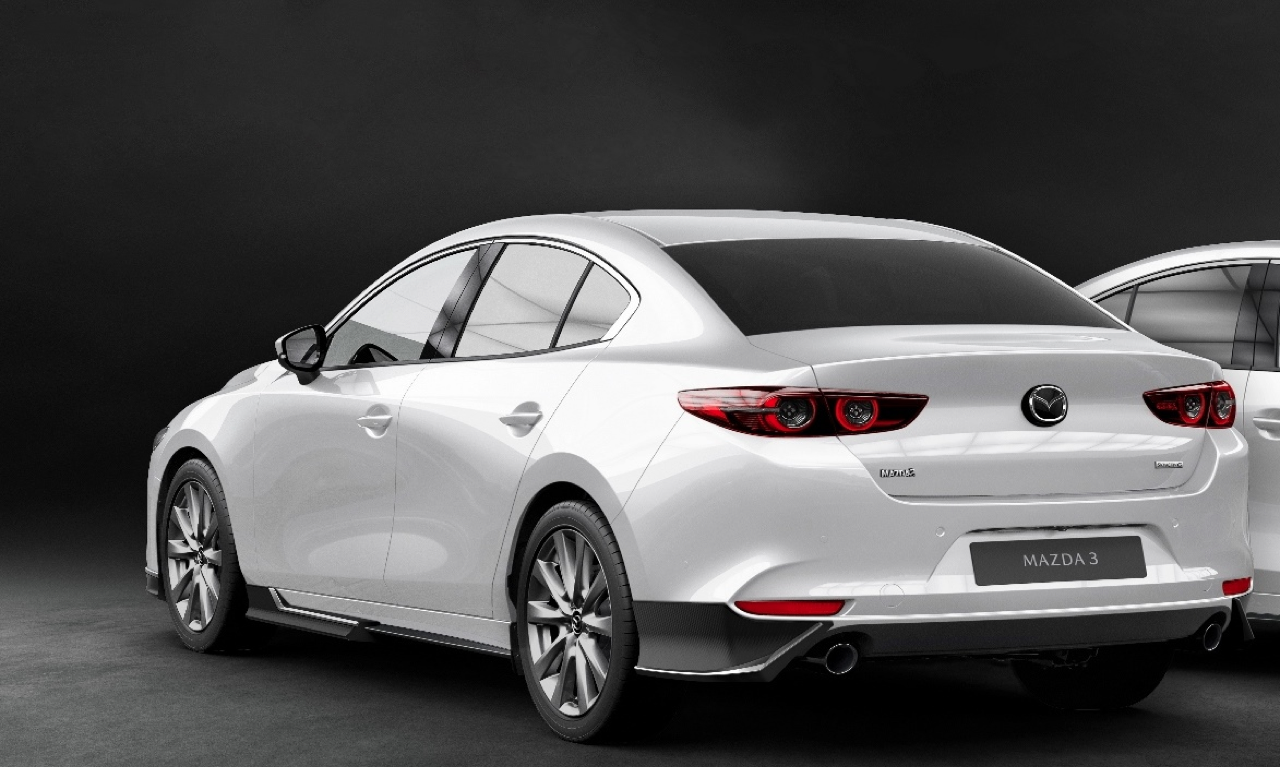 KENSHO Fastback Body Kit Set ประกอบด้วย คิ้วกันชนหน้า คิ้วกันชนข้าง คิ้วกันชนหลัง และชุดคิ้วสปอยเลอร์หลัง ราคา 15,000 บาท อุปกรณ์ตกแต่งแท้จากโรงงานผลิตเฉพาะ New Mazda3