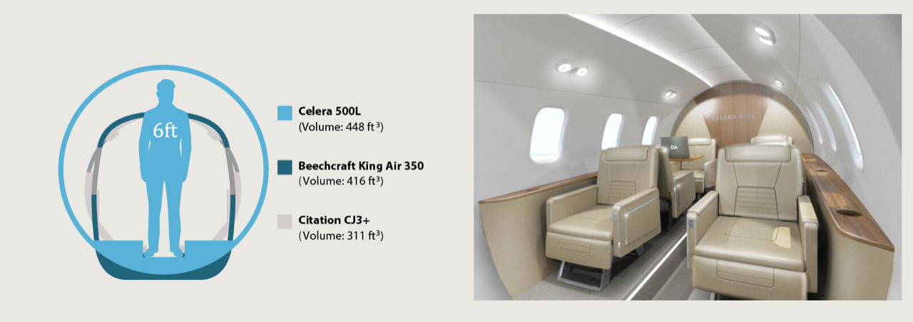 ภายในเครื่องบิน Celera 500L ผู้โดยสารจะได้พบกับห้องโดยสารที่กว้างขวาง ขนาดความสูงของห้องโดยสาร 6 ฟุต 2 นิ้ว และมีที่นั่งเทียบเท่าชั้น Firstclass ของเครื่องบินโดยสารขนาดใหญ่ จำนวน 6 ที่นั่ง ซึ่งมาในรูปแบบที่สามารถปรับแต่งได้ ในขณะที่เครื่องบินลำทดสอบยังไม่มีหน้าต่าง แต่เมื่อผลิตจริง Celera 500L จะติดตั้งหน้าต่างลามิเนตแบบใสที่มีความคงทนสูง ผู้โดยสารสามารถมองออกไปภายนอกเครื่องได้ขณะบิน หน้าต่างที่ออกแบบให้เข้ากับลำตัวจะไม่ส่งผลกระทบต่อการไหลของอากาศด้วยวัสดุแบบลามิเนต และมีรูปทรงเดียวกันกับหน้าต่างในลำตัวเครื่องบินทั่วไป