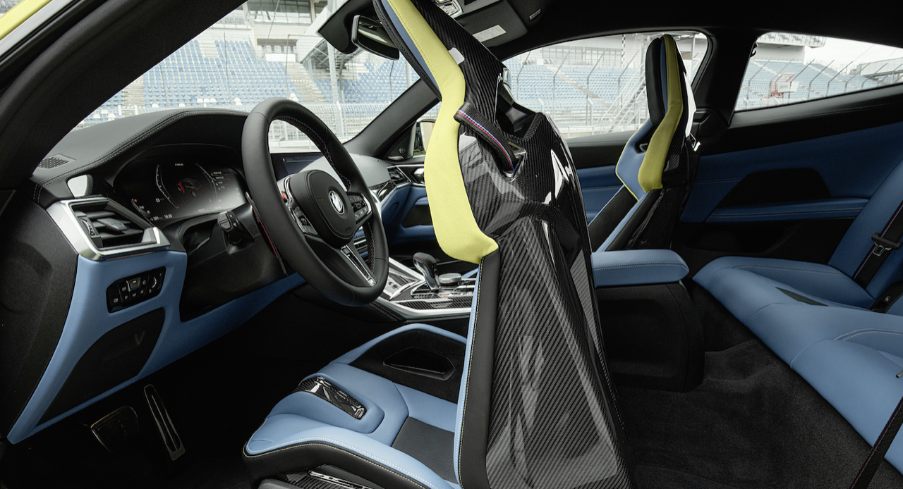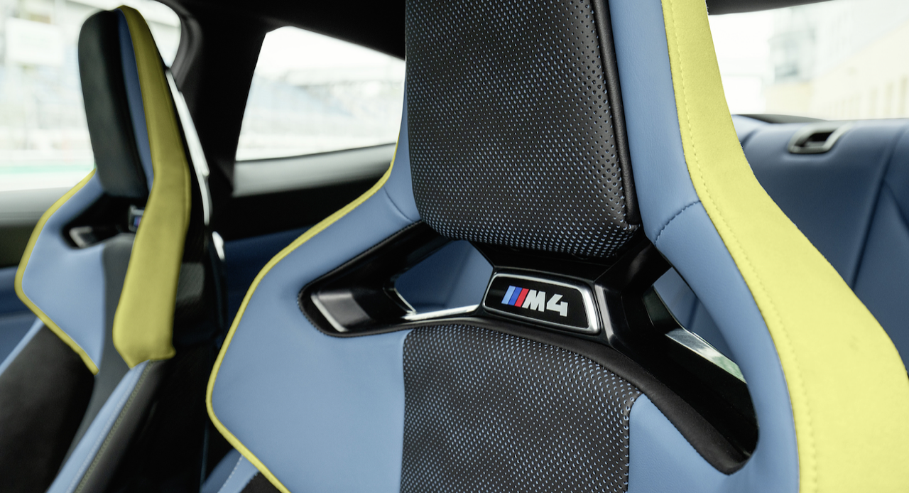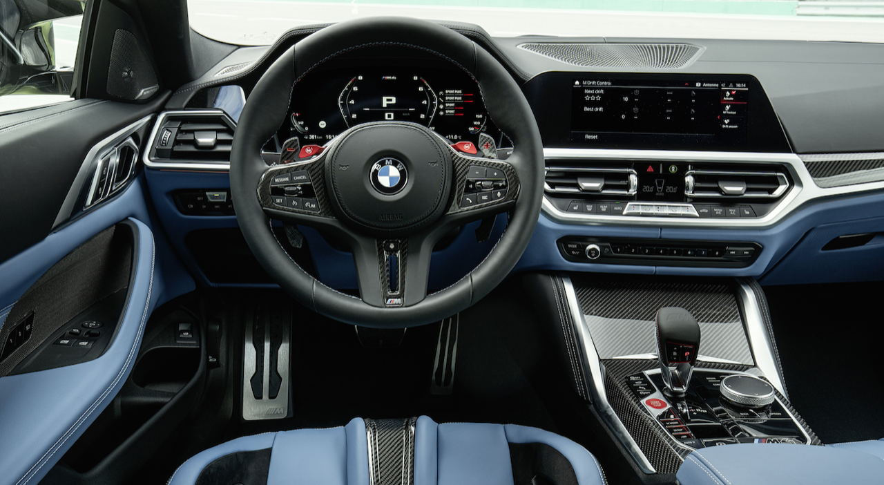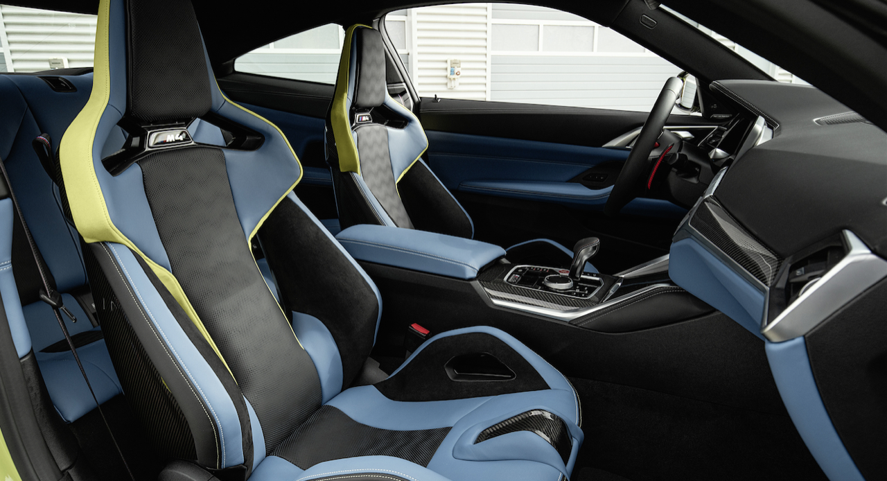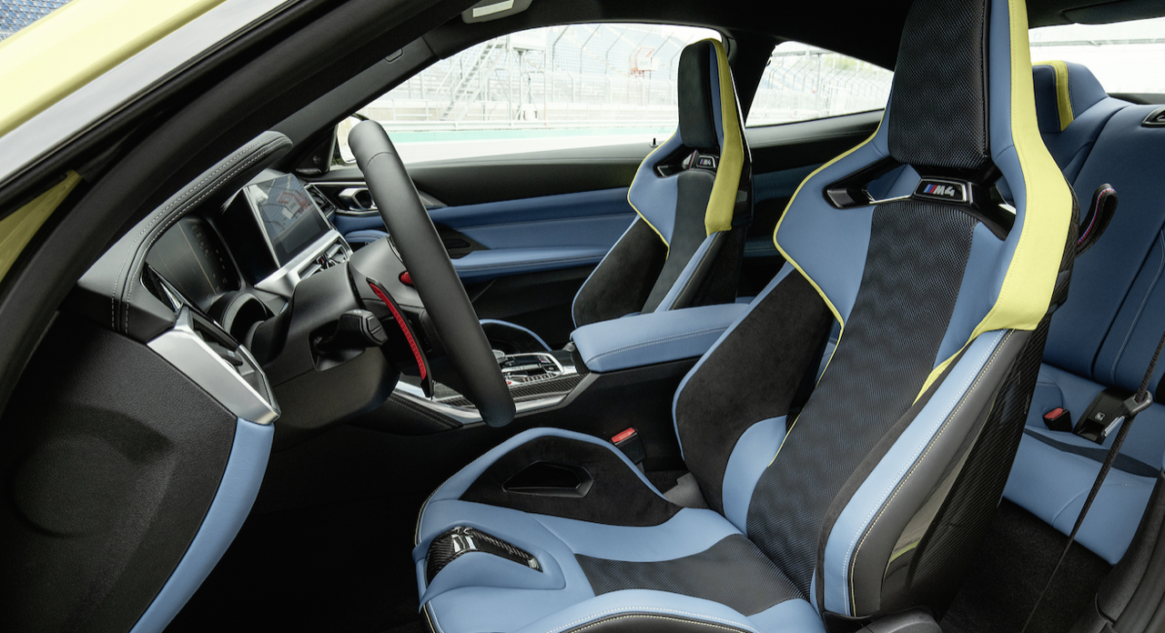 การตกแต่งภายในของ M3 และ M4 นั้นไม่น่าแปลกใจว่าทำไมถึงเหมือนกับของ 3 Series และ 4 Series ไม่มีการตกแต่งด้วยลายไม้ M ทั้งสองรุ่น ใช้วัสดุอลูมิเนียมหรือคาร์บอนไฟเบอร์สำหรับงานภายในเท่านั้น จอแสดงผลขนาด 12.3 นิ้ว หน้าจออินโฟเทนเมนต์ 10.25 นิ้ว เป็นอุปกรณ์มาตรฐาน เช่นเดียวกับเบาะนั่งแบบสปอร์ตใหม่ล่าสุด BMW นำเสนอเบาะนั่งคาร์บอนไฟเบอร์ชุดใหม่ ช่วยลดน้ำหนักได้ 9.5 กิโลกรัม นอกจากนี้ยังมีคัตเอาต์สำหรับเข็มขัดนิรภัยแบบแข่ง สีภายในแบบใหม่ เช่น Kyalami Orange ใน M3 และ Yas Marina Blue ใน M4