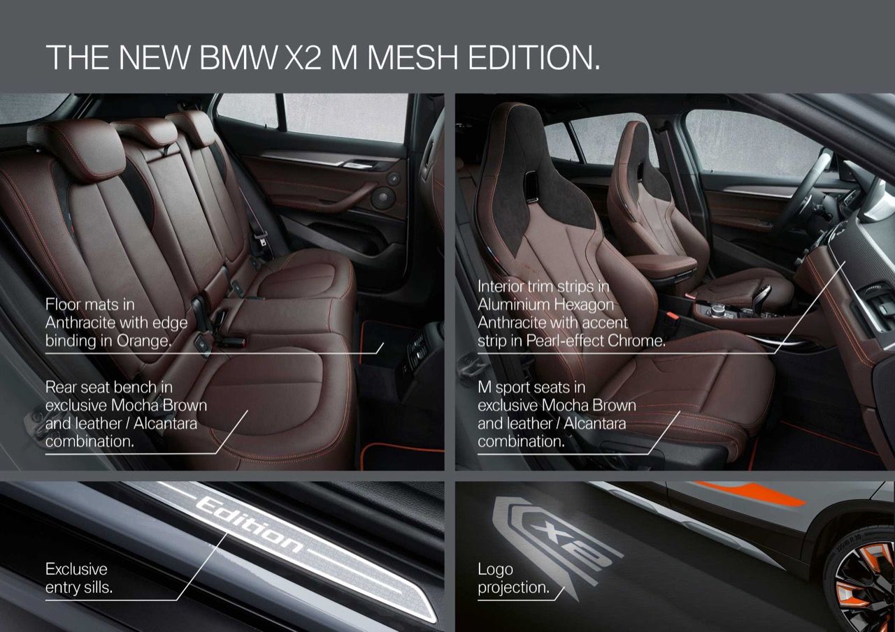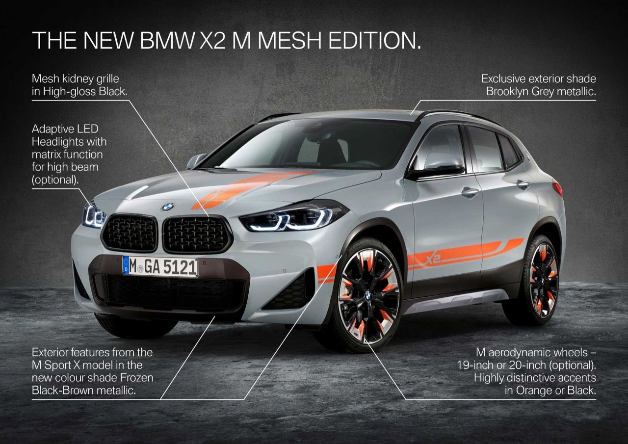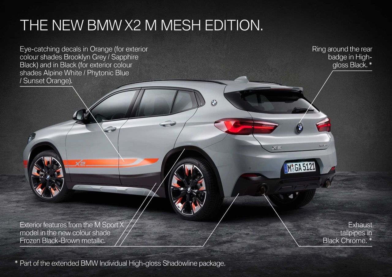 BMW X2 ปรากฏตัวในปี 2560 ในฐานะรถครอสโอเวอร์ขนาดกะทัดรัดที่ตอบสนองต่อลูกค้าที่ชื่นชอบการเดินทางท่องเที่ยวในวันหยุด สามปีต่อมา BMW แบรนด์รถยนต์ชั้นนำจากบาวาเรีย ทำการลงมือปรับแต่งตัวรถ X2 รุ่น sDRIVE 28i ด้วยการตกแต่งในสไตล์ที่แปลกใหม่ให้กับครอสโอเวอร์ครอบครัวขนาดกะทัดรัด ด้วยรูปลักษณ์ในเวอร์ชัน X2 M Mesh Edition ซึ่งมีจุดเด่นอยู่ที่สีตัวถัง และรูปแบบของงานตกแต่งภายในที่สวยงามสำหรับการกระตุ้นยอดขาย X2 M Mesh Edition มีสีภายนอกให้เลือกห้าสี เช่น Phytonic Blue Metallic, Alpine White, Black Sapphire Metallic, Sunset Orange Metallic และเฉดสีใหม่ที่เรียกว่า Brooklyn Grey Metallic เป็นทางเลือกสำหรับลูกค้าที่ต้องการความแตกต่าง