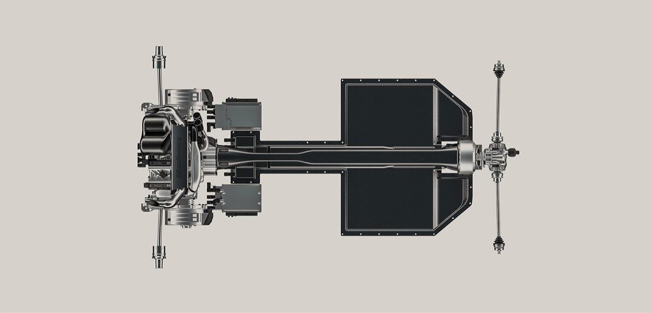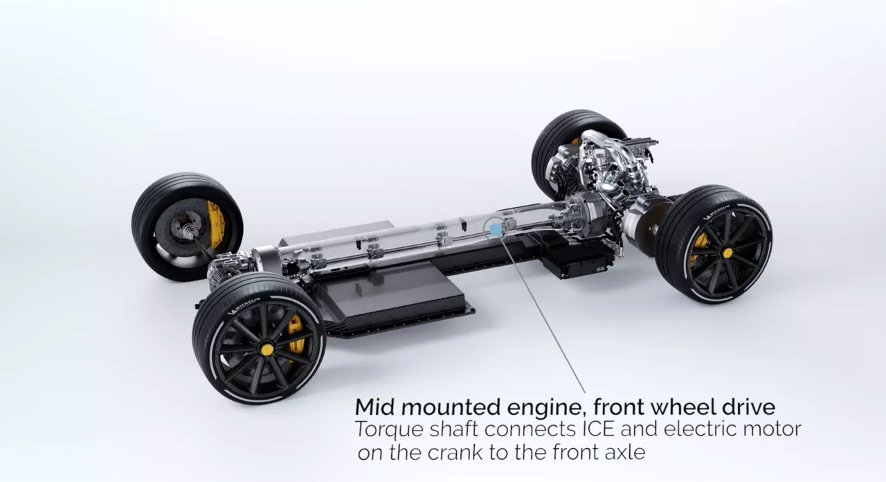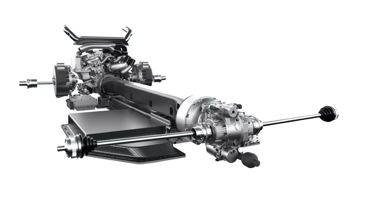 มอเตอร์ไฟฟ้าสามตำแหน่ง ตัวแรกติดตั้งเชื่อมต่อกับเพลาข้อเหวี่ยงของเครื่องยนต์ มีกำลัง 400 แรงม้า แรงบิด 500 นิวตันเมตร มอเตอร์ตัวแรกที่ติดกับเครื่องรับหน้าที่ส่งแรงบิดไปที่ล้อคู่หน้าด้วยชุดเกียร์ Single-speed Direct-drive พร้อมระบบควบคุมแรงบิดอิเล็กทรอนิกส์ Torque Vectoring Control